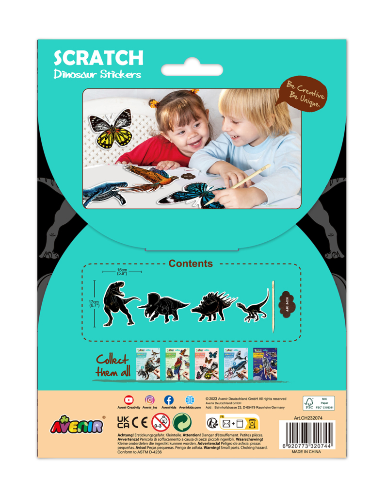 Intoarceti-va in era preistorica si aduceti magia dinozaurilor in viata copiilor cu Abtibildurile razuibile - Dinozauri din colectia Creatii Naturale! Perfecte pentru micii aventurieri si pasionati de dinozauri, aceste abtibilduri ofera ore intregi de distractie si creativitate. Caracteristici principale: Tematica Dinozaurilor: Fiecare set include abtibilduri cu designuri fascinante de dinozauri, perfect concepute pentru a capta imaginatia copiilor. Modelele variate si colorate aduc la viata creaturi preistorice, transformand orice suprafata intr-un peisaj din era dinozaurilor. Efect Razuilibil: Abtibildurile sunt dotate cu un strat special care poate fi razuit pentru a dezvalui culori si imagini ascunse. Acest efect interactiv adauga un element de surpriza si distractie, incurajand copiii sa exploreze si sa descopere. Aplicare Usoara: Abtibildurile se aplica cu usurinta pe orice suprafata curata si uscata, inclusiv pe caiete, pereti, jucarii si multe altele. Sunt ideale pentru decorarea camerei, personalizarea obiectelor si stimularea creativitatii. Siguranta si Calitate: Fabricate din materiale non-toxice si de inalta calitate, aceste abtibilduri sunt complet sigure pentru utilizare de catre copii. Parintii pot fi siguri ca micutii lor se distreaza intr-un mod sigur si placut. Usor de Indepartat: Abtibildurile se indeparteaza usor fara a lasa urme lipicioase sau reziduuri, facandu-le ideale pentru schimbari frecvente de decor si activitati creative. Ideal pentru Cadou : Cu un design atragator si un efect de razuire captivant, setul de abtibilduri razuibile - Dinozauri este cadoul perfect pentru orice copil pasionat de dinozauri si explorare. Dimensiuni: Setul contine abtibilduri de dimensiuni variate, potrivite pentru diferite aplicatii si suprafete. Instructiuni de utilizare: Alegeti o suprafata curata si uscata. Aplicati abtibildurile cu usurinta si folositi un instrument de razuit (inclus) pentru a descoperi culorile ascunse. Dupa utilizare, abtibildurile pot fi indepartate fara probleme. Contine : 4 abtibilduri razuibile 1 stilou pentru razuit 1 servetel de curatare in forma de nor Materiale : Hartie stilou de bambus material textil Atentie! Piese mici. Pericol de sufocare.