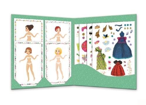 Setul conține o mapă cartonată cu buzunare pentru depozitare, 8 planșe cu manechine (9,5 x 14 cm) și 4 coli cu autocolante reutilizabile (14 x 20 cm). Este recomandat pentru copiii cu vârsta între 4 și 8 ani și este confecționat din hârtie și carton, respectând reglementările EN71&ASTM.