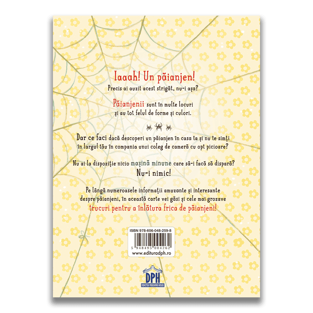 Într-o lume plină de păianjeni de toate formele și culorile, copiii vor învăța cum să reacționeze atunci când întâlnesc un păianjen în casă. Cartea oferă informații amuzante și interesante despre păianjeni, însoțite de sfaturi creative și distractive pentru a-i ajuta pe cei mici să se simtă confortabil în prezența acestor insecte.