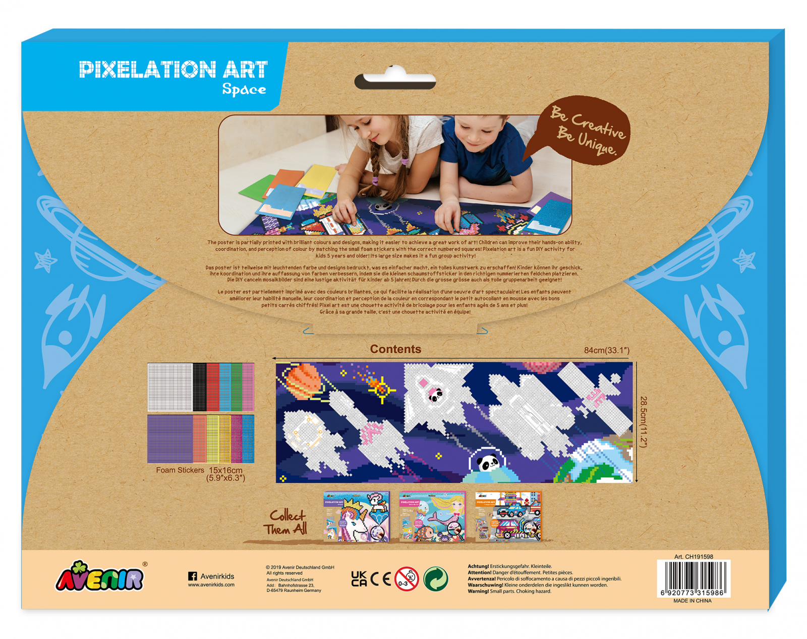 Setul de mozaic - Pixelation Art este o activitate creativa super distractiva care ii va distra pe copii ore intregi! Posterul pliabil este partial imprimat cu culori si modele, facandu-l mai usor de completat pentru copii. Copiii isi pot imbunatati abilitatea practica, coordonarea si perceptia culorilor Pur si simplu potriviti autocolantele cu patratele numerotate pentru a completa capodopera. Odata ce au terminat, ajuta-i sa-l atarne pe peretele dormitorului. O activitate grozava de bucurat in companie sau singur, potrivita de la varsta de 5 ani in sus. Dimensiune: 24 x 31,5 x 1 cm Dimensiuni cutie: 31.5 24 1.4 cm
