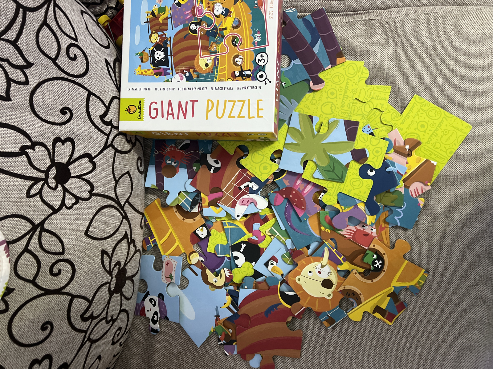Puzzle-ul se așază direct pe podea, iar copiii pot asambla piesele pentru a descoperi o scenă plină de aventuri pe mare, cu personaje și detalii specifice lumii piraților. Piesele mari, din carton gros, sunt ușor de manevrat de către mâinile mici și permit construirea unui tablou de 100 x 70 cm.