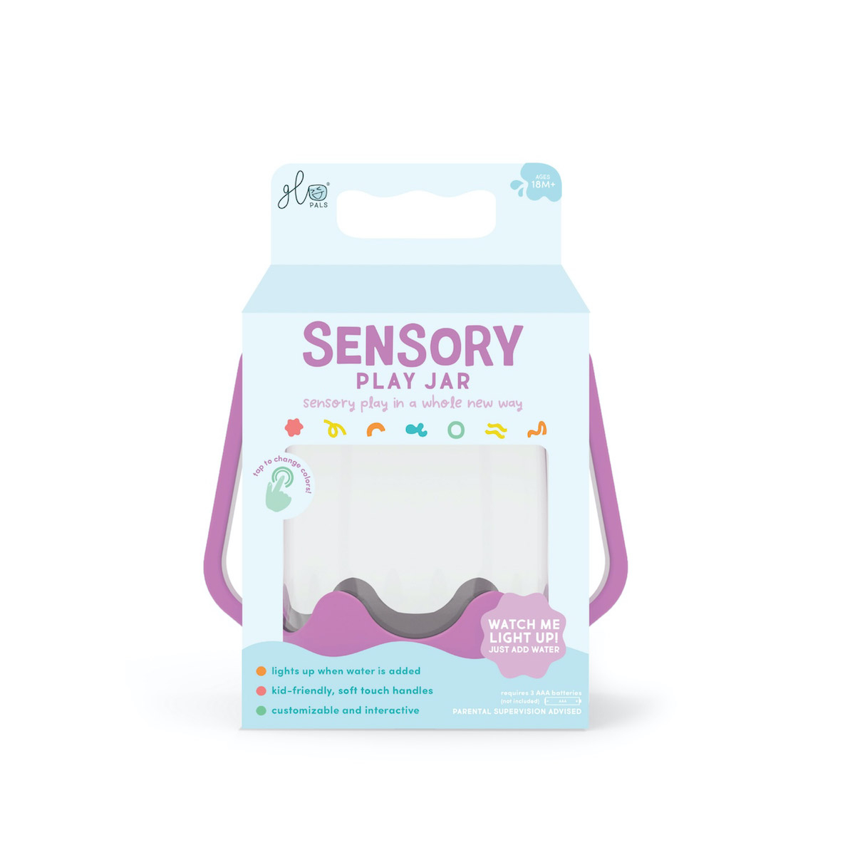 Impachetati putina distractie si aventura in urmatoarea dvs. excursie cu un borcan de joc senzorial! Sprijina dezvoltarea senzoriala. Schimba felul in care cei mici se joaca - cu fiecare atingere a capacului. Borcanul senzorial este usor de folosit, si va deveni in curand companionul preferat al copilului tau. Doar adauga apa ca sa activezi borcanul si apoi schimba culorile cu o apasare pe capac - perfect pentru joaca senzoriala portabila. 1. Adauga apa. 2. Adauga accesoriile preferate 3. Priveste cum lumineaza. Capac cu sistem de siguranta, pentru copii. Manere moi la atingere. Atingeti pentru a schimba culorile si pentru a face lucrurile si mai amuzante, umpleti borcanul de joaca senzoriala cu alte elemente magice, cum ar fi cuburile Glo Pals - toate inchise ermetic cu ajutorul capacului rezistent la varsare. Cu diferite culori din care poti alege, vei fi pregatit pentru toata distractia senzoriala! Varsta recomandata 18 luni+ Dimensiune: 22 x 16 x 11 cm Intr-o lume care poate fi uneori coplesitoare pentru cei mici, oferindu-le instrumente simple, dar captivante, care sa le sprijine bunastarea, creativitatea si simturile, ii poate ajuta sa se simta sustinuti. Suntem atat de incantati de noul nostru borcan de joaca senzoriala cu lumina si de toate beneficiile uimitoare pe care le va aduce micilor nostri prieteni: Explorarea si dezvoltarea senzoriala. Copiii sunt curiosi in mod natural in legatura cu lumea din jurul lor, iar borcanul de joaca senzoriala este un instrument excelent pentru ca acestia sa isi implice in mod activ simturile, sprijinind in acelasi timp dezvoltarea lor prin joc. preferati. Confort linistitor intr-un borcan . Stralucirea blanda din borcanul de joaca senzoriala poate fi incredibil de linistitoare pentru cei mici. Este completarea perfecta pentru un colt de calmare, o activitate in liniste sau o sesiune de lectura confortabila cu o carte buna. Stai jos, relaxeaza-te si bucura-te de stralucire. Creativitate si imaginatie - Borcanele de joaca senzoriala sunt complet personalizabile. Copiii isi pot folosi creativitatea pentru a adauga in borcan obiectele lor preferate. Acest lucru nu numai ca incurajeaza exprimarea de sine si creativitatea, dar le insufla si un sentiment de realizare pe masura ce sunt martorii creatiei finite. Invatarea prin joc - Borcanul de joaca senzoriala este un instrument extraordinar pentru a invata prin joc si pentru a promova abilitatile de comunicare. O activitate cu adevarat minunata si captivanta este un joc de i-spy (spionez), invitandu-l pe cel mic sa identifice diferitele obiecte pe care le vede in borcan. Explorati cauza si efectul, intorcand borcanul cu susul in jos, astfel incat cel mic sa vada cum se stinge lumina, apoi intorcandu-l cu susul in jos, astfel incat stralucirea borcanului sa se aprinda din nou. Este o modalitate excelenta de a le captiva curiozitatea si un mod practic de a explora cauza si efectul. Instructiuni de folosire: Pentru a indeparta capacul de siguranta pentru copii: strangeti spre interior cele doua manere laterale in timp ce rasuciti capacul pentru a-l indeparta. Asigurati-va ca fixati bine capacul inainte de joaca. - Adaugati accesoriile senzoriale preferate ale copilului dvs. si umpleti cu apa pentru a activa functia de iluminare a borcanului. - Borcanul va trece automat printr-un ciclu de 9 culori. Atingeti baza Borcanului pentru a schimba manual culoarea luminii. Necesita (nu include) 3 baterii AAA