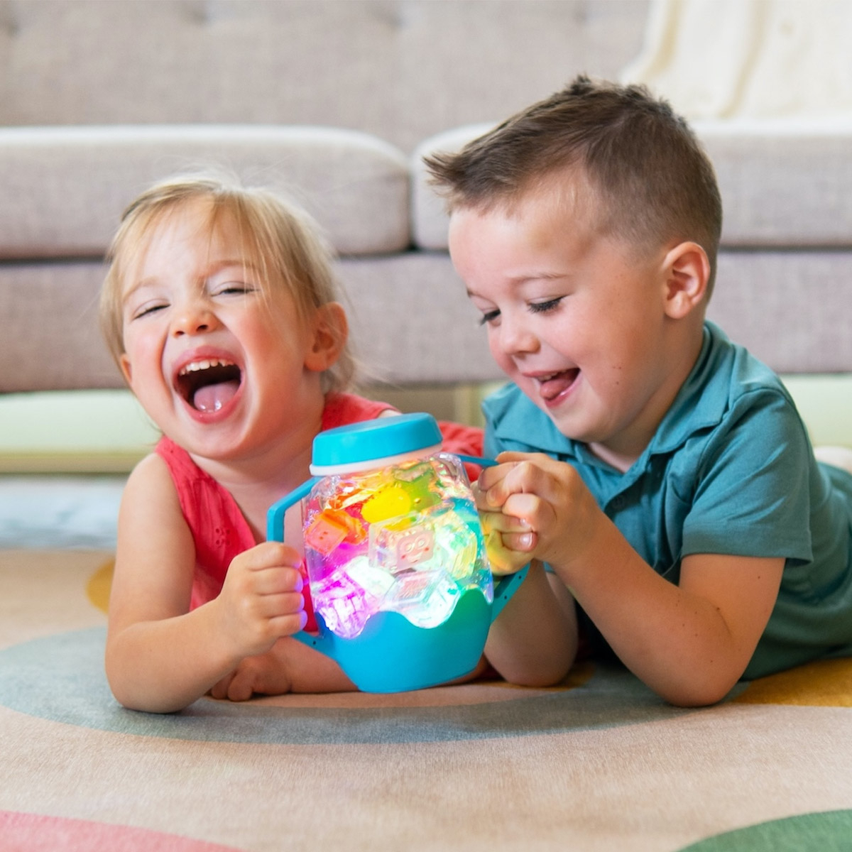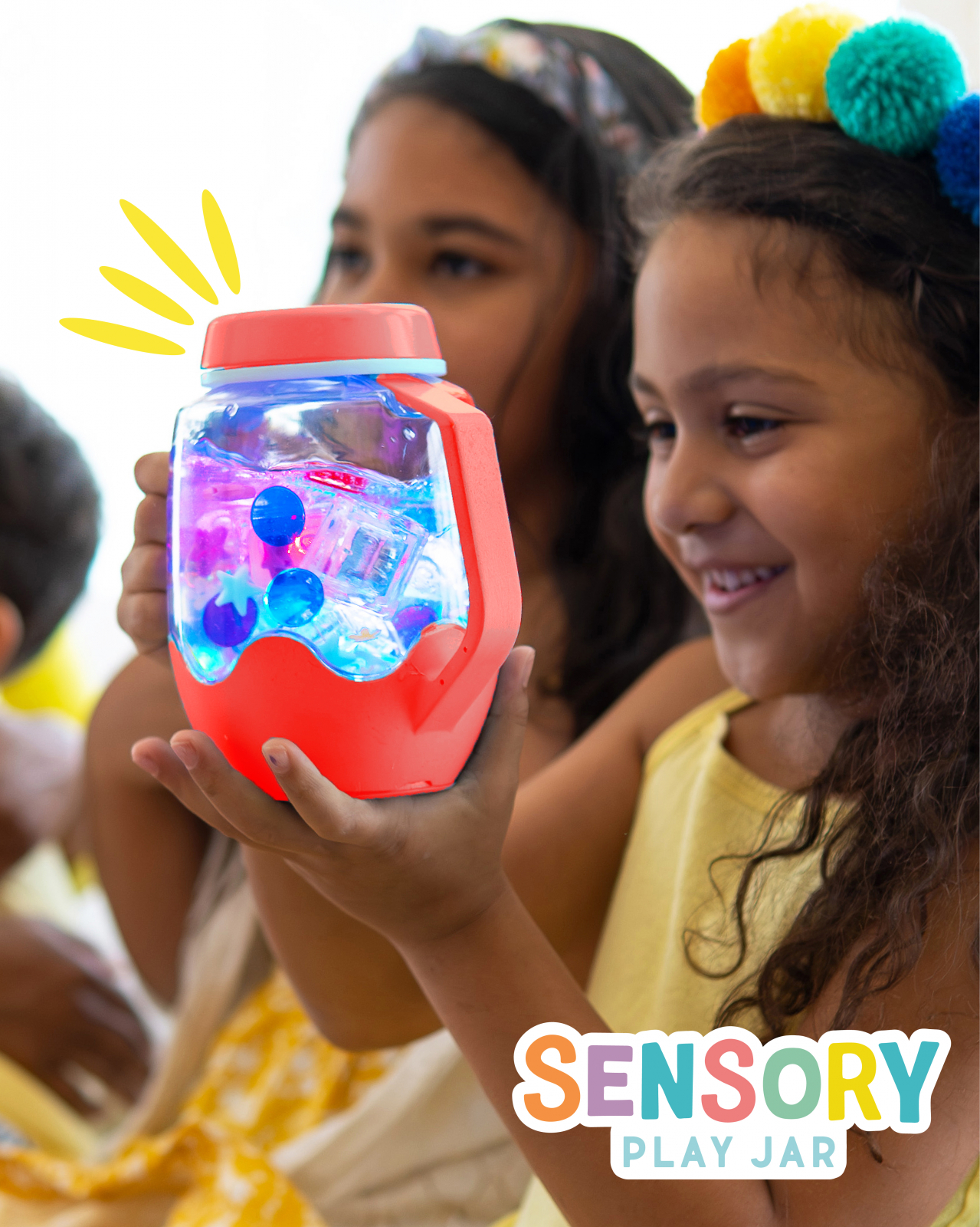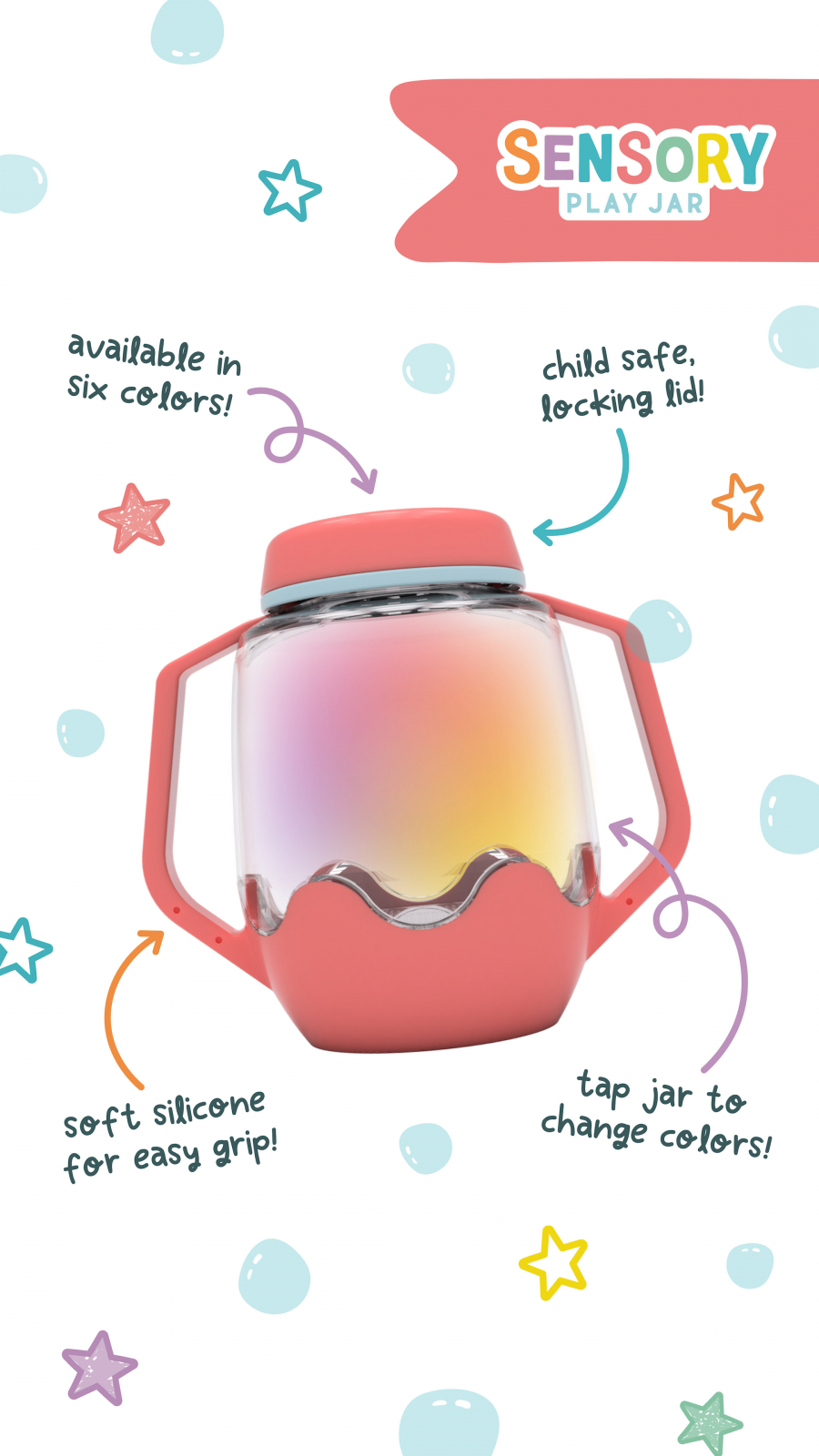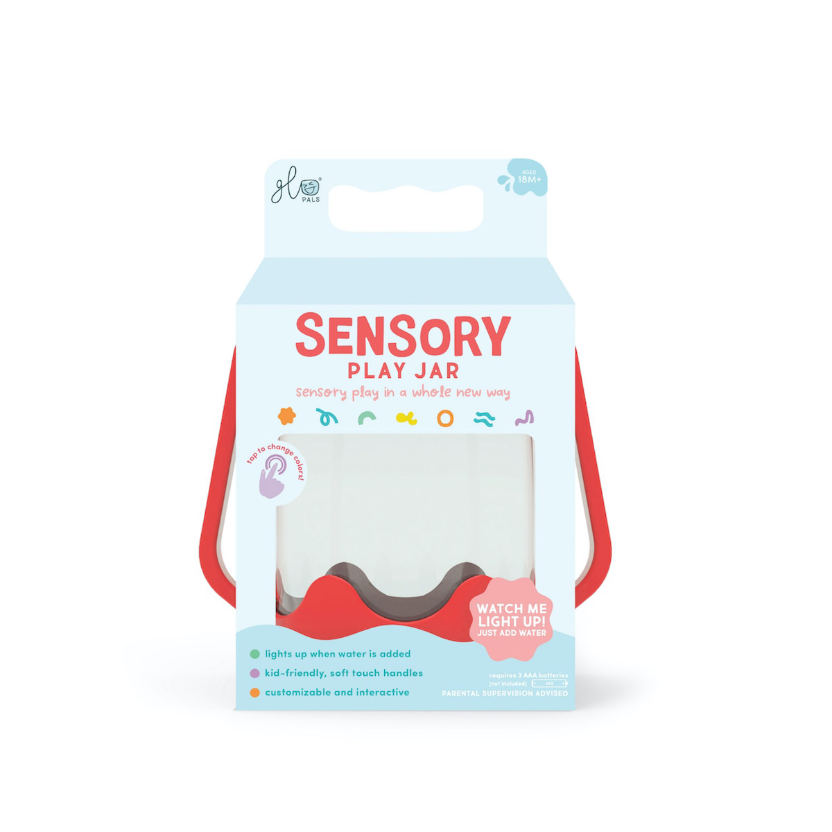 Impachetati putina distractie si aventura in urmatoarea dvs. excursie cu un borcan de joc senzorial! Sprijina dezvoltarea senzoriala. Schimba felul in care cei mici se joaca - cu fiecare atingere a capacului. Borcanul senzorial este usor de folosit, si va deveni in curand companionul preferat al copilului tau. Doar adauga apa ca sa activezi borcanul si apoi schimba culorile cu o apasare pe capac - perfect pentru joaca senzoriala portabila. 1. Adauga apa. 2. Adauga accesoriile preferate 3. Priveste cum lumineaza. Capac cu sistem de siguranta, pentru copii. Manere moi la atingere. Atingeti pentru a schimba culorile si pentru a face lucrurile si mai amuzante, umpleti borcanul de joaca senzoriala cu alte elemente magice, cum ar fi cuburile Glo Pals - toate inchise ermetic cu ajutorul capacului rezistent la varsare. Cu diferite culori din care poti alege, vei fi pregatit pentru toata distractia senzoriala! Varsta recomandata 18 luni+ Dimensiune: 22 x 16 x 11 cm Intr-o lume care poate fi uneori coplesitoare pentru cei mici, oferindu-le instrumente simple, dar captivante, care sa le sprijine bunastarea, creativitatea si simturile, ii poate ajuta sa se simta sustinuti. Suntem atat de incantati de noul nostru borcan de joaca senzoriala cu lumina si de toate beneficiile uimitoare pe care le va aduce micilor nostri prieteni: Explorarea si dezvoltarea senzoriala. Copiii sunt curiosi in mod natural in legatura cu lumea din jurul lor, iar borcanul de joaca senzoriala este un instrument excelent pentru ca acestia sa isi implice in mod activ simturile, sprijinind in acelasi timp dezvoltarea lor prin joc. preferati. Confort linistitor intr-un borcan . Stralucirea blanda din borcanul de joaca senzoriala poate fi incredibil de linistitoare pentru cei mici. Este completarea perfecta pentru un colt de calmare, o activitate in liniste sau o sesiune de lectura confortabila cu o carte buna. Stai jos, relaxeaza-te si bucura-te de stralucire. Creativitate si imaginatie - Borcanele de joaca senzoriala sunt complet personalizabile. Copiii isi pot folosi creativitatea pentru a adauga in borcan obiectele lor preferate. Acest lucru nu numai ca incurajeaza exprimarea de sine si creativitatea, dar le insufla si un sentiment de realizare pe masura ce sunt martorii creatiei finite. Invatarea prin joc - Borcanul de joaca senzoriala este un instrument extraordinar pentru a invata prin joc si pentru a promova abilitatile de comunicare. O activitate cu adevarat minunata si captivanta este un joc de i-spy (spionez), invitandu-l pe cel mic sa identifice diferitele obiecte pe care le vede in borcan. Explorati cauza si efectul, intorcand borcanul cu susul in jos, astfel incat cel mic sa vada cum se stinge lumina, apoi intorcandu-l cu susul in jos, astfel incat stralucirea borcanului sa se aprinda din nou. Este o modalitate excelenta de a le captiva curiozitatea si un mod practic de a explora cauza si efectul. Instructiuni de folosire: Pentru a indeparta capacul de siguranta pentru copii: strangeti spre interior cele doua manere laterale in timp ce rasuciti capacul pentru a-l indeparta. Asigurati-va ca fixati bine capacul inainte de joaca. - Adaugati accesoriile senzoriale preferate ale copilului dvs. si umpleti cu apa pentru a activa functia de iluminare a borcanului. - Borcanul va trece automat printr-un ciclu de 9 culori. Atingeti baza Borcanului pentru a schimba manual culoarea luminii. Necesita (nu include) 3 baterii AAA