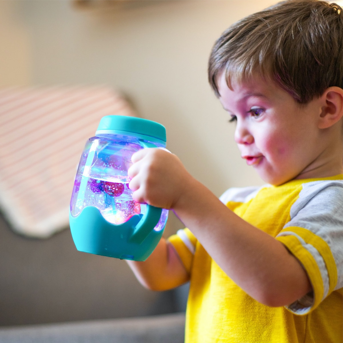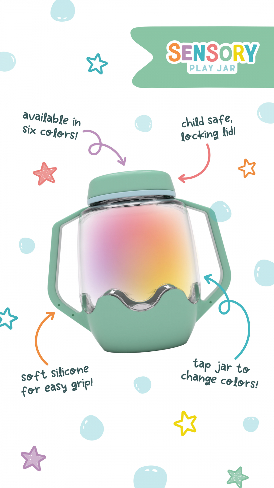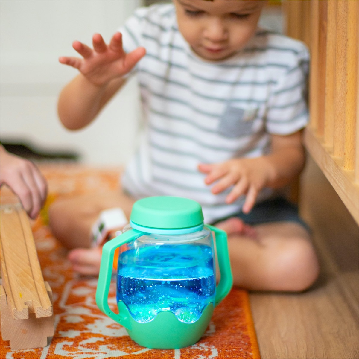 Impachetati putina distractie si aventura in urmatoarea dvs. excursie cu un borcan de joc senzorial! Sprijina dezvoltarea senzoriala. Schimba felul in care cei mici se joaca - cu fiecare atingere a capacului. Borcanul senzorial este usor de folosit, si va deveni in curand companionul preferat al copilului tau. Doar adauga apa ca sa activezi borcanul si apoi schimba culorile cu o apasare pe capac - perfect pentru joaca senzoriala portabila. 1. Adauga apa. 2. Adauga accesoriile preferate 3. Priveste cum lumineaza. Capac cu sistem de siguranta, pentru copii. Manere moi la atingere. Atingeti pentru a schimba culorile si pentru a face lucrurile si mai amuzante, umpleti borcanul de joaca senzoriala cu alte elemente magice, cum ar fi cuburile Glo Pals - toate inchise ermetic cu ajutorul capacului rezistent la varsare. Cu diferite culori din care poti alege, vei fi pregatit pentru toata distractia senzoriala! Varsta recomandata 18 luni+ Dimensiune: 22 x 16 x 11 cm Intr-o lume care poate fi uneori coplesitoare pentru cei mici, oferindu-le instrumente simple, dar captivante, care sa le sprijine bunastarea, creativitatea si simturile, ii poate ajuta sa se simta sustinuti. Suntem atat de incantati de noul nostru borcan de joaca senzoriala cu lumina si de toate beneficiile uimitoare pe care le va aduce micilor nostri prieteni: Explorarea si dezvoltarea senzoriala. Copiii sunt curiosi in mod natural in legatura cu lumea din jurul lor, iar borcanul de joaca senzoriala este un instrument excelent pentru ca acestia sa isi implice in mod activ simturile, sprijinind in acelasi timp dezvoltarea lor prin joc. preferati. Confort linistitor intr-un borcan . Stralucirea blanda din borcanul de joaca senzoriala poate fi incredibil de linistitoare pentru cei mici. Este completarea perfecta pentru un colt de calmare, o activitate in liniste sau o sesiune de lectura confortabila cu o carte buna. Stai jos, relaxeaza-te si bucura-te de stralucire. Creativitate si imaginatie - Borcanele de joaca senzoriala sunt complet personalizabile. Copiii isi pot folosi creativitatea pentru a adauga in borcan obiectele lor preferate. Acest lucru nu numai ca incurajeaza exprimarea de sine si creativitatea, dar le insufla si un sentiment de realizare pe masura ce sunt martorii creatiei finite. Invatarea prin joc - Borcanul de joaca senzoriala este un instrument extraordinar pentru a invata prin joc si pentru a promova abilitatile de comunicare. O activitate cu adevarat minunata si captivanta este un joc de i-spy (spionez), invitandu-l pe cel mic sa identifice diferitele obiecte pe care le vede in borcan. Explorati cauza si efectul, intorcand borcanul cu susul in jos, astfel incat cel mic sa vada cum se stinge lumina, apoi intorcandu-l cu susul in jos, astfel incat stralucirea borcanului sa se aprinda din nou. Este o modalitate excelenta de a le captiva curiozitatea si un mod practic de a explora cauza si efectul. Instructiuni de folosire: Pentru a indeparta capacul de siguranta pentru copii: strangeti spre interior cele doua manere laterale in timp ce rasuciti capacul pentru a-l indeparta. Asigurati-va ca fixati bine capacul inainte de joaca. - Adaugati accesoriile senzoriale preferate ale copilului dvs. si umpleti cu apa pentru a activa functia de iluminare a borcanului. - Borcanul va trece automat printr-un ciclu de 9 culori. Atingeti baza Borcanului pentru a schimba manual culoarea luminii. Necesita (nu include) 3 baterii AAA