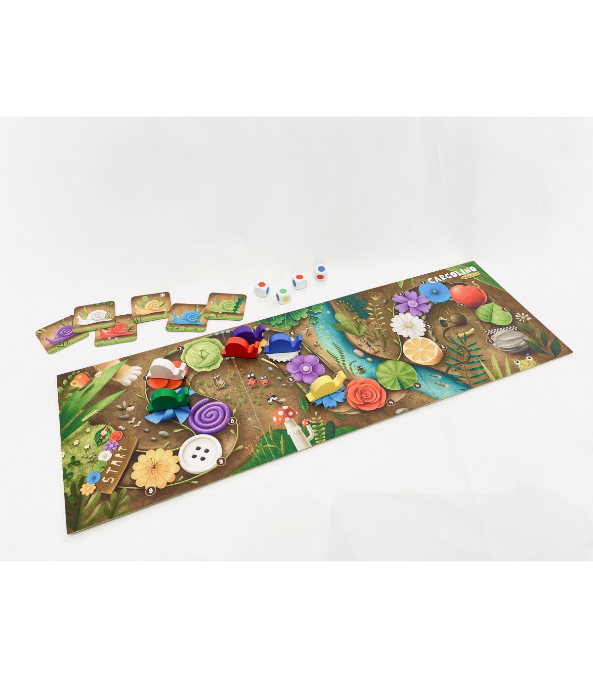 Un joc minunat cu un design incantator si un scop paradigma: castiga cine ramane ultimul! CARGOLINO VALENTINO - 2-6 jucatori - 5 ani+ - 15 min, 8482; O cursa nebuna de melci unde castigatorul este cel mai lent! Doamnelor si Domnilor! Cel mai mare eveniment sportive al anului sta sa inceapa: CURSA MELCILOR! Toti jucatorii se pregatesc la linia de start cu un singur scop: sa evite sa ajunga primul la linia de sfarsit! CONTINUT: - Patru zaruri colorate - sase melci de lemn - sase jetoane melc - 1 Plansa de joc - 40 de jetoane cochilie - Instructiuni Scopul jocului: Jucatorii trebuie sa foloseasca rezultatul zarurilor pentru a muta melcii celorlalti jucatori, astfel incat melcii lor sa ramana pe ultima pozitie la sfarsitul cursei. Varsta 5 ani+ Dimensiuni cutie: 38 x 21 x 14 cm Regulamentul poate fi descarcat si aici