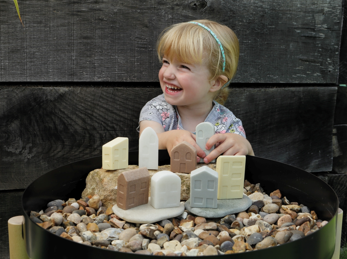 Acest set de case tactile a fost conceput pentru a oferi inspiratie pentru povesti, fara a ghida gandirea copiilor. Create dintr-un amestec de piatra rezistent, aceste case fermecatoare au o varietate de culori si dimensiuni naturale, cu ferestre si usi gravate. Ele pot fi folosite pentru a spori jocul cu lumea mica in interior sau in aer liber si sunt suficient de rezistente pentru a putea fi curatate cu usurinta dupa aceea. Fiecare set include patru perechi de case, una mica si una mare, cu caracteristici si forme de acoperis diferite. Varsta 2+.