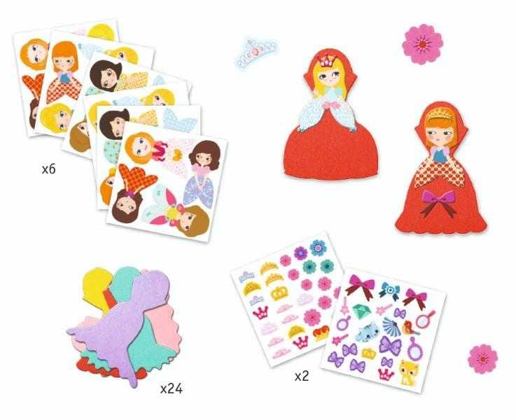Setul include 24 de forme de „prințesă” din pâslă și 24 de „fețe”, oferind numeroase posibilități de personalizare. După ce micuții au terminat de decorat, pot folosi creațiile pentru a-și înfrumuseța camera sau alte spații.