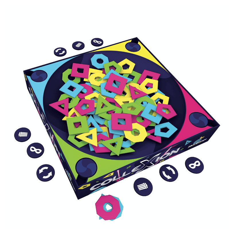 Cu patru tipuri de poligoane (triunghi, pătrat, pentagon și octogon) și patru culori vibrante (verde, galben, roz și albastru), COLLEXION oferă o varietate de combinații strategice. În total, sunt 80 de poligoane, organizate în 5 seturi din fiecare tip și culoare.
