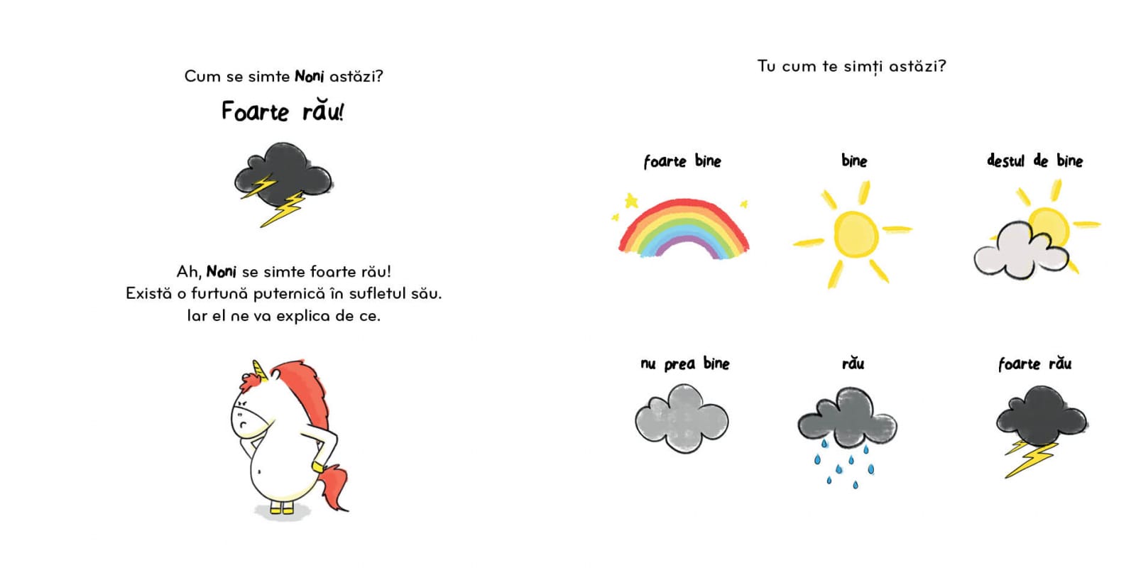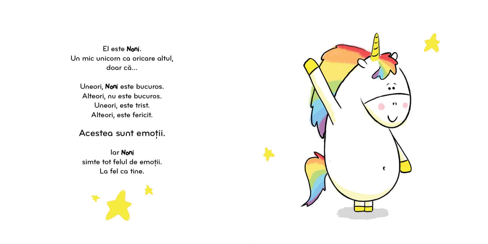 Noni, un mic unicorn adorabil, are o coamă magică ce își schimbă culorile în funcție de emoțiile sale. În această poveste captivantă, Noni se confruntă cu o zi dificilă, fiind foarte supărat și nerăbdător. Agitat și bătând din picior, Noni își dorește ca totul să se întâmple imediat. Copiii vor descoperi cum Noni își recâștigă buna dispoziție printr-un exercițiu de sofrologie inclus în carte, menit să ajute micuții să își gestioneze emoțiile și să își recapete calmul.