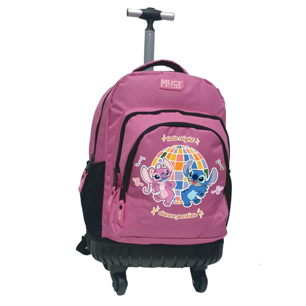 Ghiozdan scolar tip Troller, Disney STITCH & ANGEL, 3 compartimente, 4 roti, 30l, 34x20x44 cm, MUST TEAM