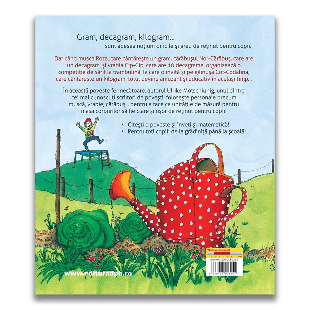 Scrisă de renumita autoare Ulrike Motschiunig, povestea folosește personaje adorabile precum musca Rosa, vrabia Cip-Cip și cărăbușul Nor-Cărăbuș pentru a face noțiunile de gram, decagram și kilogram ușor de înțeles și memorat. Copiii vor fi încântați să participe la competiția de sărit la trambulină organizată de aceste personaje, alături de găinușa Cot-Codalina.