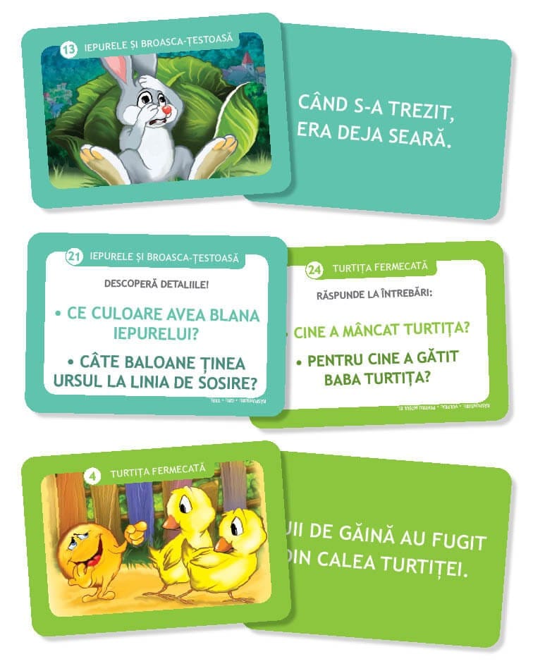 Setul Iepurele și broasca-țestoasă • Turtita fermecată - Carduri pentru învățarea citirii este un instrument valoros pentru părinți și educatori, oferind o metodă inovatoare și distractivă de a învăța citirea prin povești și jocuri interactive.