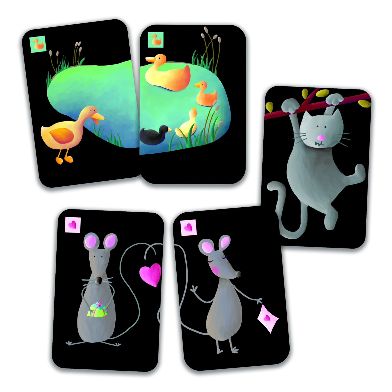 Jocul de cărți Djeco Mistigri este o activitate captivantă de asociere, perfectă pentru dezvoltarea abilităților cognitive și sociale ale copiilor cu vârste între 4 și 7 ani. Fiecare participant își selectează și elimină perechile de cărți formate din mâna inițială, având grijă să evite păstrarea cărții Mistigri.