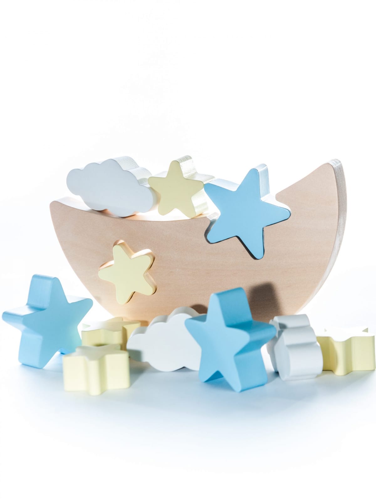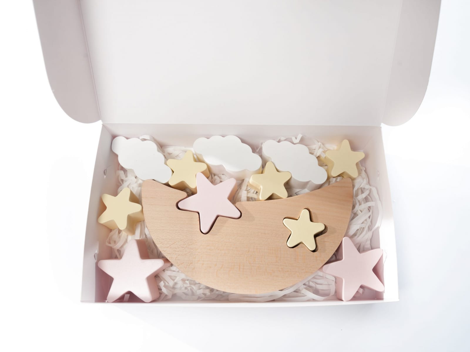 Un joc de echilibru fascinant, perfect pentru dezvoltarea coordonării și dexterității la copii. Acest set handmade permite clădirea steluțelor și norilor pe o lună ușor curbată, oferind ore întregi de distracție și învățare.