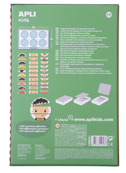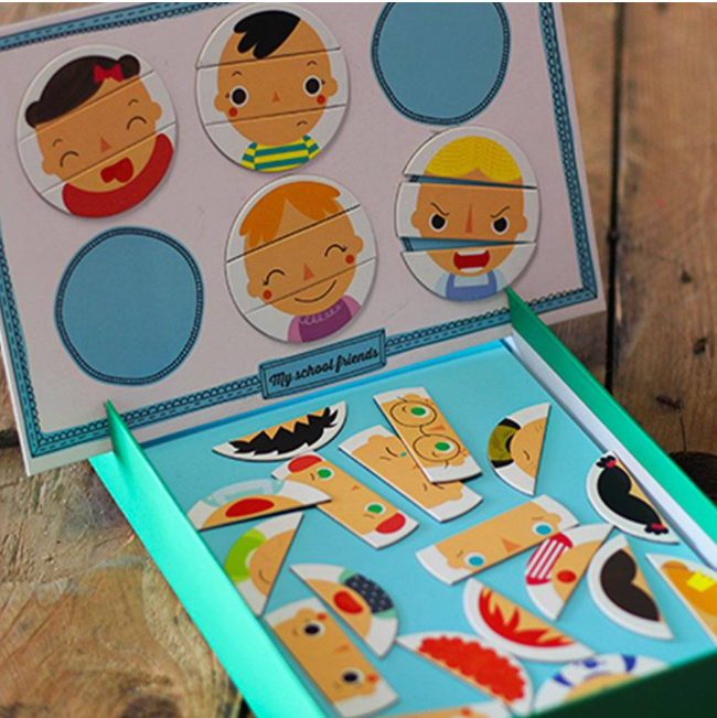 Setul conține o tablă magnetică și 30 de piese cu diferite elemente faciale, care pot fi combinate pentru a reda emoții precum bucurie, tristețe sau surpriză. Jocul stimulează imaginația și ajută copiii să înțeleagă mai bine emoțiile prin joacă.