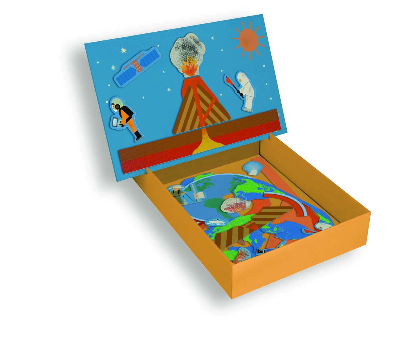 Copiii pot descoperi structura Pământului, plăcile tectonice, tipurile de vulcani și instrumentele utilizate pentru studierea acestora. Setul include o tablă magnetică, piese ilustrate și un ghid explicativ detaliat, care îi ajută să învețe prin joacă și explorare.