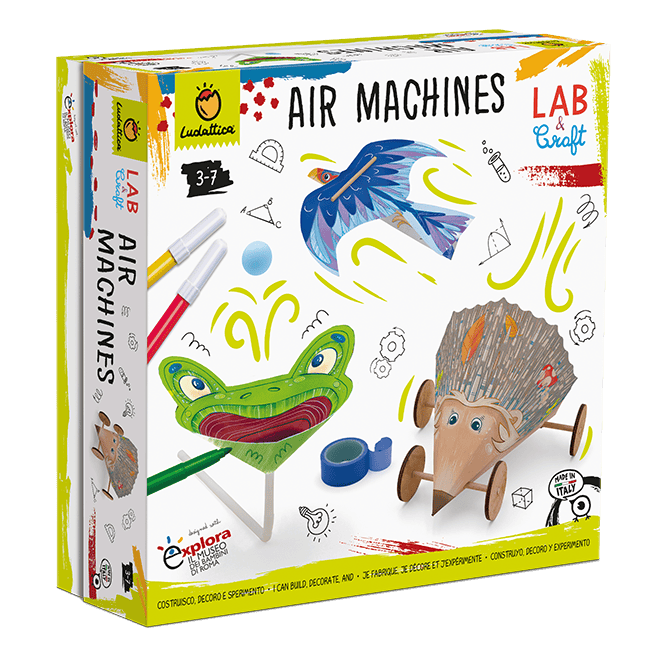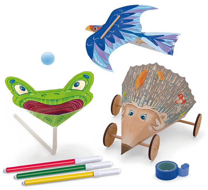 Forța aerului transformă jocul într-o aventură fascinantă! Ariciul alunecă pe roțile sale, rândunica de hârtie zboară ca un zmeu, iar mingiuța rămâne suspendată în gura broscuței. Acest set creativ permite copiilor să decoreze și să construiască obiecte care funcționează datorită aerului, oferindu-le o introducere captivantă în știință prin intermediul creativității și experimentelor.