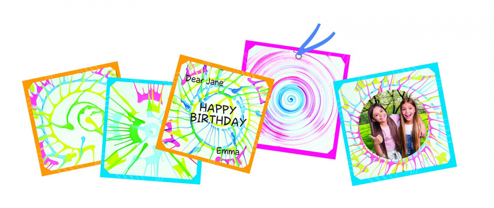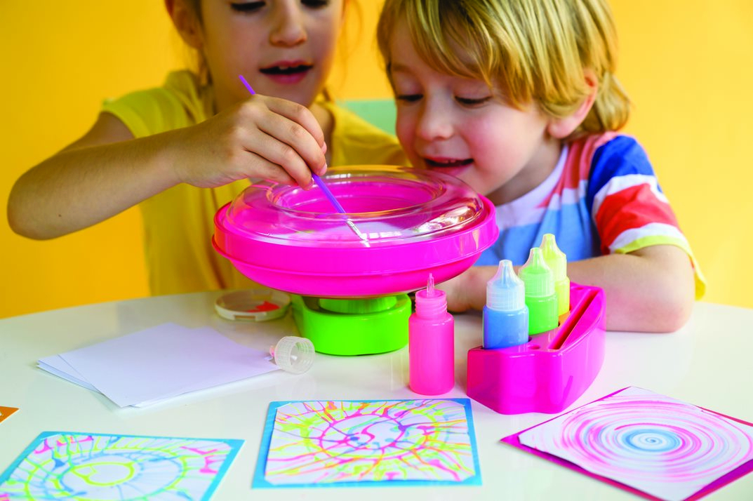 Creati modele fanteziste cu aceasta masina de arta rotativa alimentata manual! Faceti carti si lucrari de arta pe care le puteti monta pe carton colorat. Nu necesita baterii - doar apasati pentru a roti si apoi fiti creativ! Setul contine: o masina de spin art (28 x 22 x 7 cm), un scut de stropire, 4 tuburi de vopsea, 6 cartonase colorate pentru montare, 20 de cartonase albe si instructiuni detaliate.