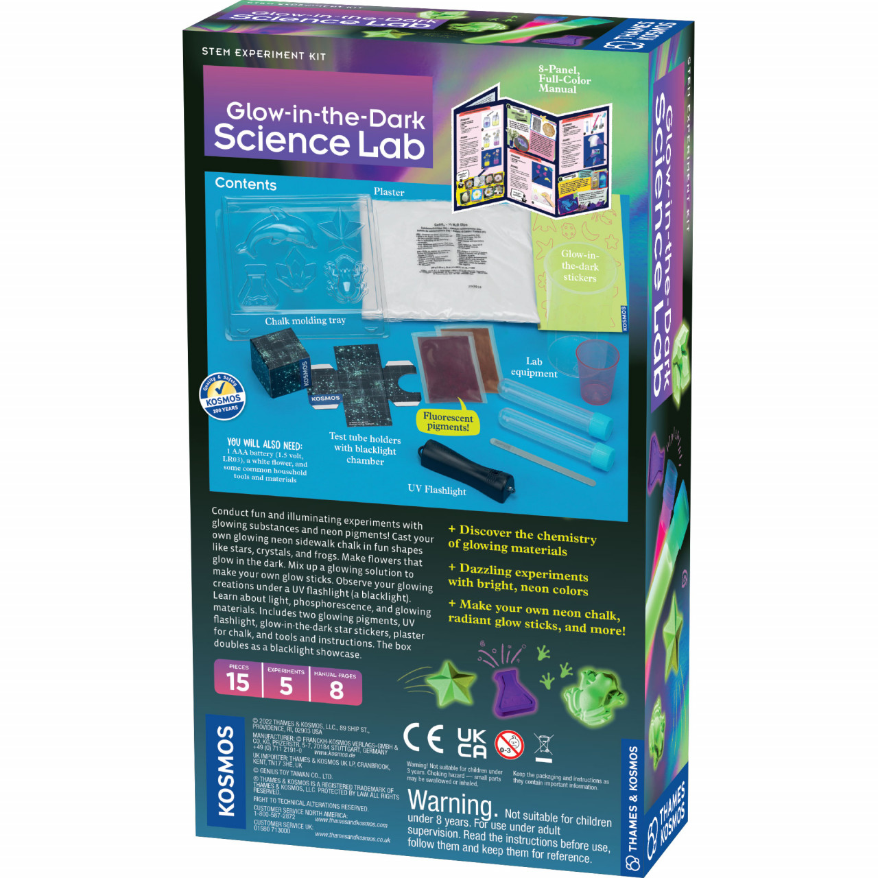 Kit STEM Sralucire in intuneric Efectuați experimente amuzante și luminoase cu substanțe strălucitoare și pigmenți neon cu acest kit științific interesant (și educativ!). Descoperiți chimia materialelor incandescente în timp ce turnați cretă de trotuar cu culori fluorescente în forme amuzante precum stele, cristale și broaște. Învățați despre lumină și fosforescență în timp ce puneți tulpinile florilor în recipeinte cu apă și pigment! Puteți observa creațiile strălucitoare sub lanterna UV inclusă și să creați o vitrină întunecată pentru a expune creațiile luminoase. Include doi pigmenți luminoși, lanternă UV (necesită baterie AAA), autocolante cu stele care strălucesc în întuneric, gips pentru cretă, precum și instrumente și instrucțiuni. Cutia kitului poate fi folosită și pentru expunere. Lumini strălucitoare neon. Conține 15 piese , 5 experimente, manual cu instrucțiuni. Vârsta recomandată: 8 - 12 ani. Confecționat din plastic. Conform reglementarilor EN71&ASTM. AVERTISMENT: Contraindicat copiilor sub 3 ani, conține piese mici. Se recomandă supravegherea copilului de către un adult în timpul jocului. Citiți instrucțiunile înainte de utilizare, urmați-le și păstrați-le pentru referință. Produs in Germania pentru Thames & Kosmos, Anglia. Manual Kit STEM Stralucire in intuneric - descarca fisier