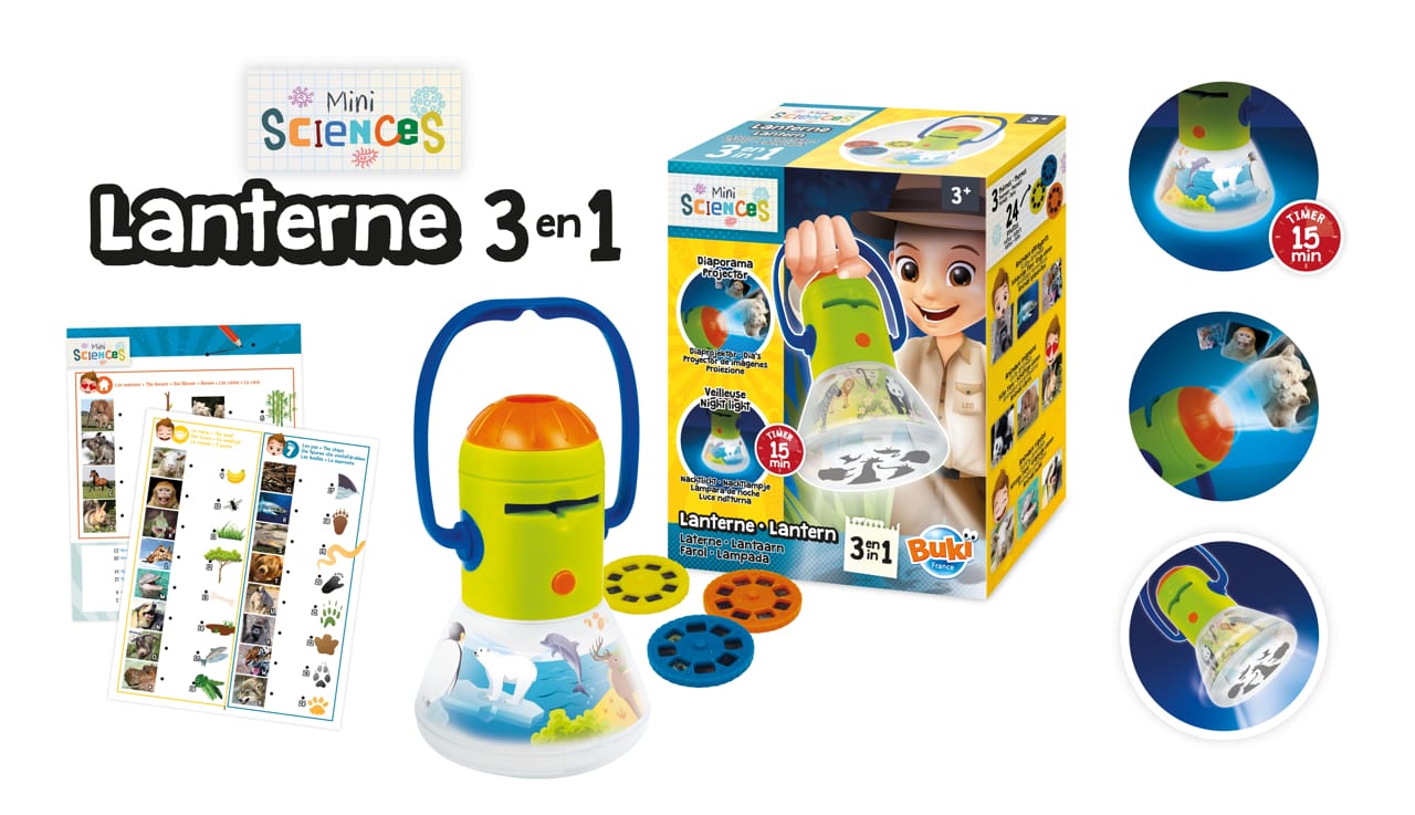 Lanterna 3 în 1 de la BUKI France este ideală pentru micii exploratori care doresc să descopere lumea fascinantă a animalelor. Această jucărie versatilă oferă trei moduri de utilizare: proiector, lumină de noapte și torță, transformând fiecare moment într-o aventură captivantă.