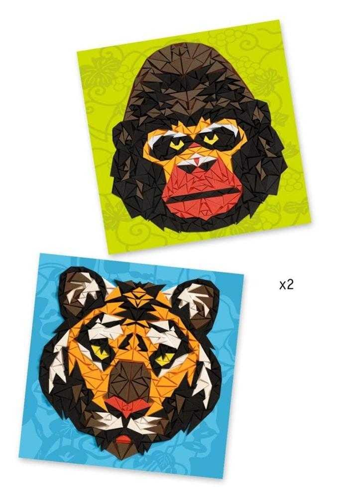 Mozaic Djeco Khan oferă o activitate creativă și originală de colaj mozaic, perfectă pentru copiii cu vârste între 6 și 7 ani. Acest set captivant permite micilor artiști să lucreze cu piese triunghiulare din spumă adezivă pentru a crea imagini impresionante ale unui tigru și ale unei gorile.