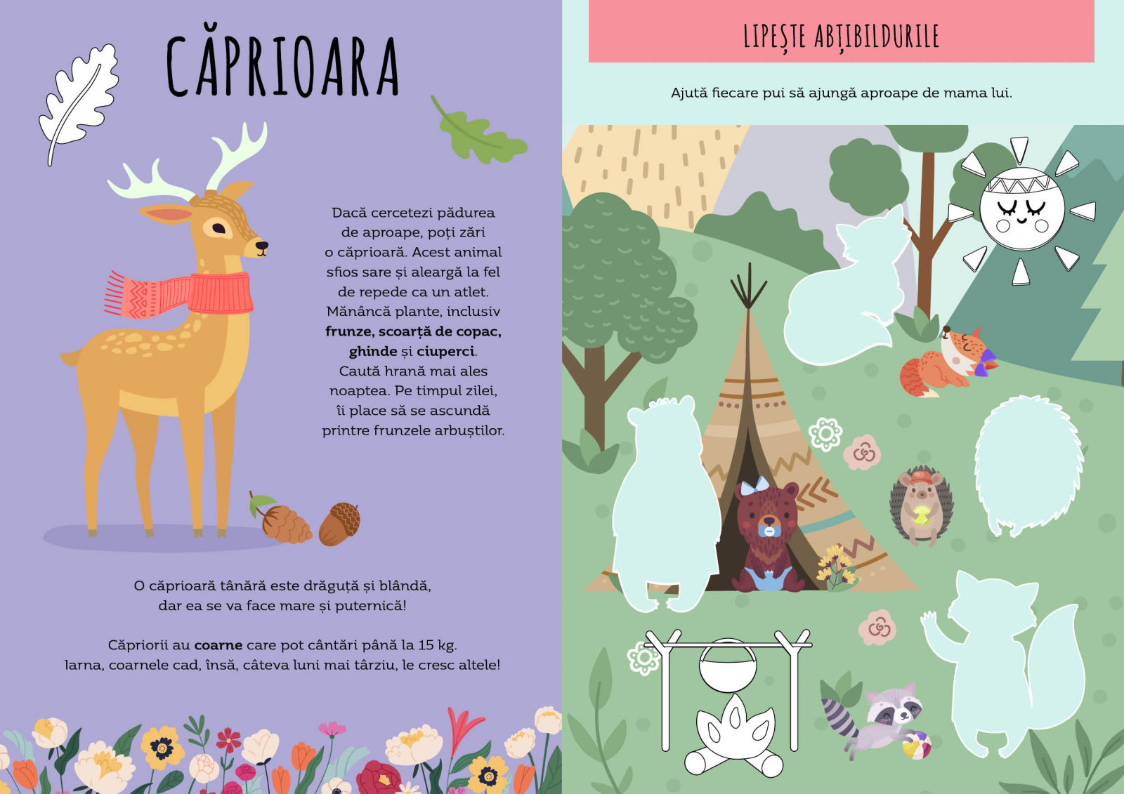 O carte cu autocolante din care copiii învață despre animalele din pădure într-un mod distractiv.