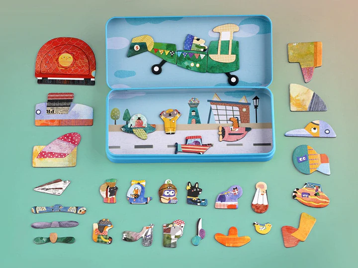 Cutiile noastre de puzzle tematice sunt ca niste calatorii magice in lumi pline de aventuri! Fiecare cutie include doua scene fermecatoare si peste 30 de piese magnetice colorate, ce asteapta sa fie asociate. Copiii pot inventa povesti captivante, lasandu-si imaginatia sa zburde. Acest joc nu doar ca stimuleaza creativitatea, dar ajuta si la dezvoltarea abilitatilor motorii fine, transformand fiecare sesiune de joaca intr-o aventura educativa plina de bucurie! Ambalaj solid - cutia de metal faciliteaza strangerea pieselor in timpul unei calatorii, permite depozitarea usoara si reprezinta un element decorativ al camerei copilului. Dimensiune cutie: 20.3 9 3.3 Setul magnetic este compact si util, adorat de copii, perfect pentru orice geanta, rucsac, bun de luat la restaurant, in calatorii sau vacante. Recomandat de la 3 ani +
