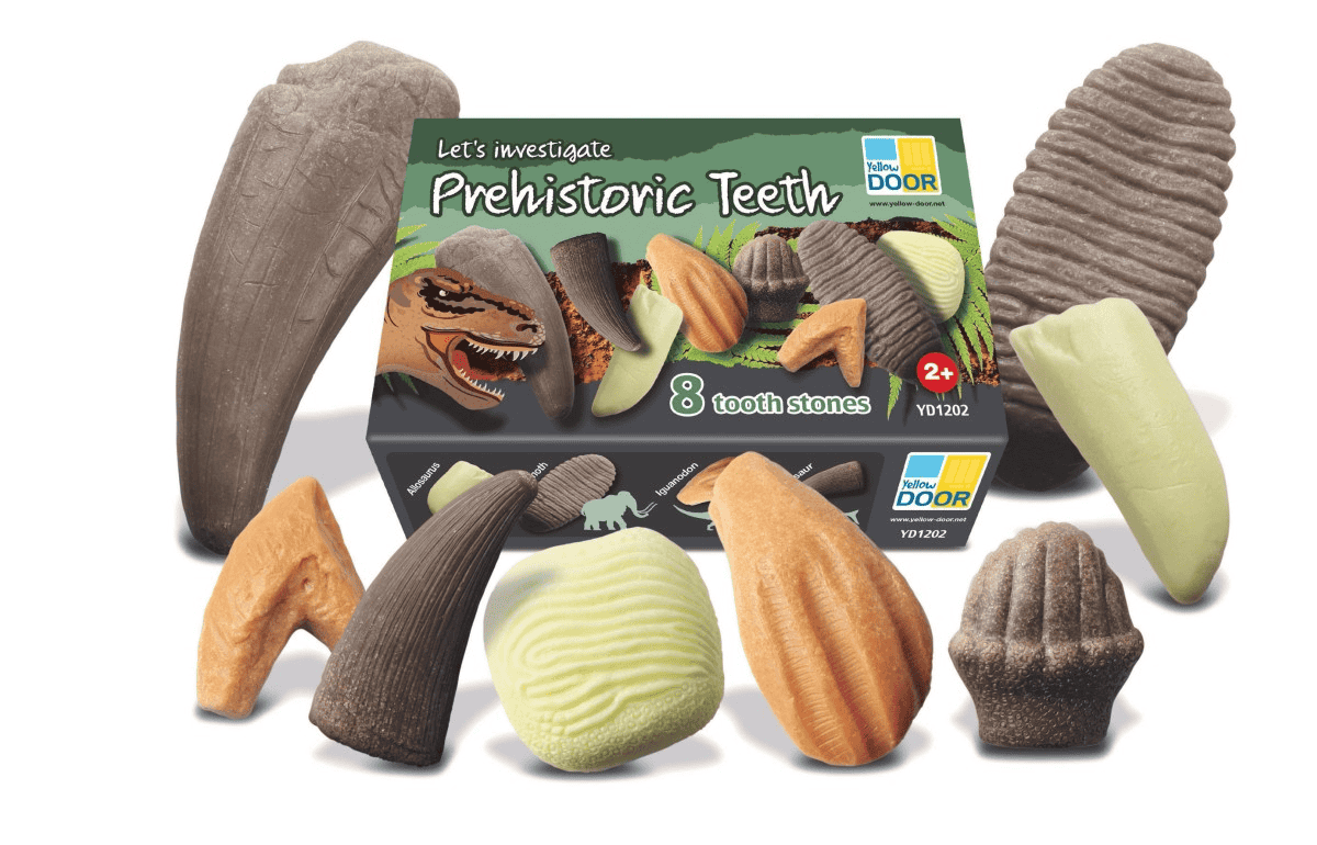 Multi copii sunt plini de admiratie, uimire si entuziasm in legatura cu dinozaurii si alte animale preistorice. Aceste pietre dintioase uimitoare vor inspira si vor spori fascinatia, provocand multe discutii si jocuri de rol. Paleontologii in devenire vor adora sa le ingroape, sa le dezgroape si sa compare descoperirile lor. Ele pot fi sortate si curatate cu usurinta, extinzand invatarea la igiena dentara. Confectionati dintr-un amestec de piatra rezistent, dintii sunt conceputi pentru a fi folositi in sol, noroi, nisip si apa. Setul contine opt pietre pentru dinti: Allosaurus, Iguanodon, Mamut, Pliosaur, Ptychodus, Stegosaurus, Triceratops si Tyrannosaurus rex. Lungime maxima 105 mm. Varsta recomandata 2 ani+.