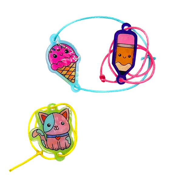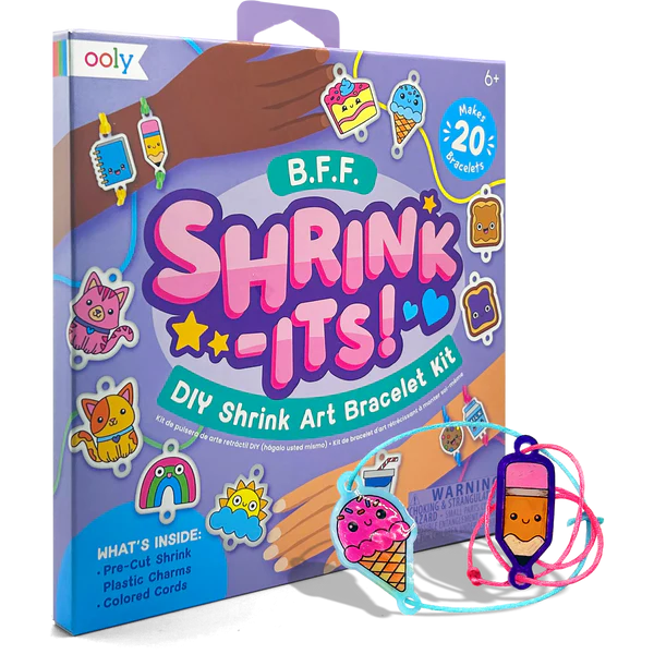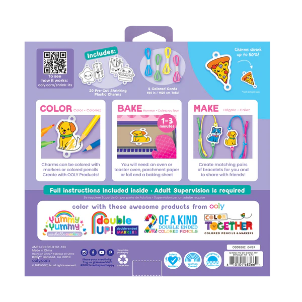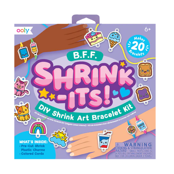 Acest set adorabil de facut bratari este proiectul perfect de bijuterii pe care cele mai bune prietene il pot face impreuna! Acest kit de arta DIY include suficiente pandantive pretaiate si corzi colorate pentru a face 20 de bratari. Fiecare pandantiv micsorat este jumatate dintr-un cuplu celebru, cum ar fi untul de arahide si jeleul, un nor si un curcubeu si multe altele! Doar coloreaza designul, roaga un adult sa le puna la cuptor si minuneaza-te cum in doar cateva minute apar pandantivele gata de a fi puse in bratara! Apoi, copiii pot decide: sunt mai mult unt de arahide decat jeleu? Mai mult lapte decat prajitura? Oricare ar fi alegerea lor, aceste bratari cu pandantive DIY sunt un mod incantator de a petrece o dupa-amiaza! Kitul include 20 de pandantive pretaiate din plastic termocontractibil si 4 snururi colorate in albastru, verde, galben si rosu Pandantivele sunt realizate din plastic usor si durabil, iar modelele includ personaje dragute precum inghetata, pisici, albine si multe altele. Este necesara supravegherea unui adult atunci cand se utilizeaza cuptorul Potrivit pentru varste de peste 6 ani
