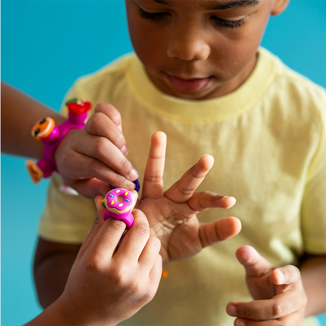 Bratari cu talismane pop-it din silicon, in culori vibrante. Incurajeaza joaca senzoriala si personalizarea.