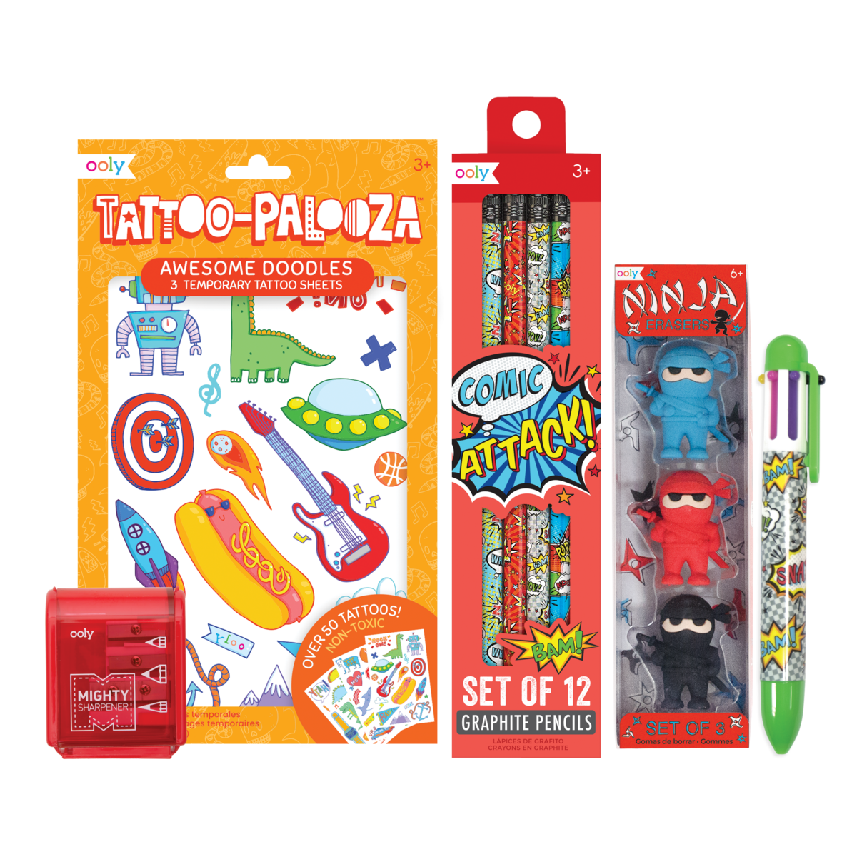 Plictiseala nu se potriveste pentru acest pachet cu tematica ninja, care este gata de cadou din mers. Pachetul de creioane Comic Attack isi va pune amprenta pe hartia dvs., in timp ce setul de trei radiere Ninja va patrunde si va elimina orice erori. Mighty Sharpener este priceput in arta fina a ascutirii creioanelor, iar stiloul Comic Attack este gata sa-si foloseasca puterile multicolore ori de cate ori este necesar. Sa nu-l uitam pe glumetul din echipa , pachetul de tatuaje temporare Awesome Doodlers, pentru ca nimic nu lupta mai bine cu plictiseala decat sa porti animale amuzante pe brate! Totul vine intr-o punga cu fermoar cu eticheta cadou, pentru un cadou super simplu. , 1 set de creioane din grafit Comic Attack nr.2 , 1 set de 3 gume Ninja de 1 ¾, inaltime , 1 ascutitoare de creion Mighty , 1 pachet (cu 3 coli) de tatuaje temporare Tattoo-Palooza Awesome Doodlers , 1 Comic Attack 6 clic stilou multicolor in albastru, verde, rosu, galben, violet sau negru , Continut intr-o punga din plastic cu eticheta de cadou pentru cadou usor , Dimensiunea pachetului cadou 15.875 x 27.305 x 5.08 cm Dimensiune cutie cm: 5.08 X 15.88 X 27.31 Greutate: 454 grame Nu este potrivit pentru copiii sub 6 ani din cauza pieselor mici. Pericol de sufocare.