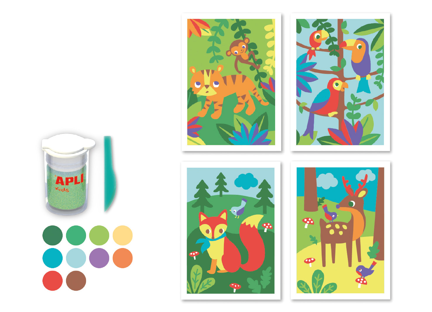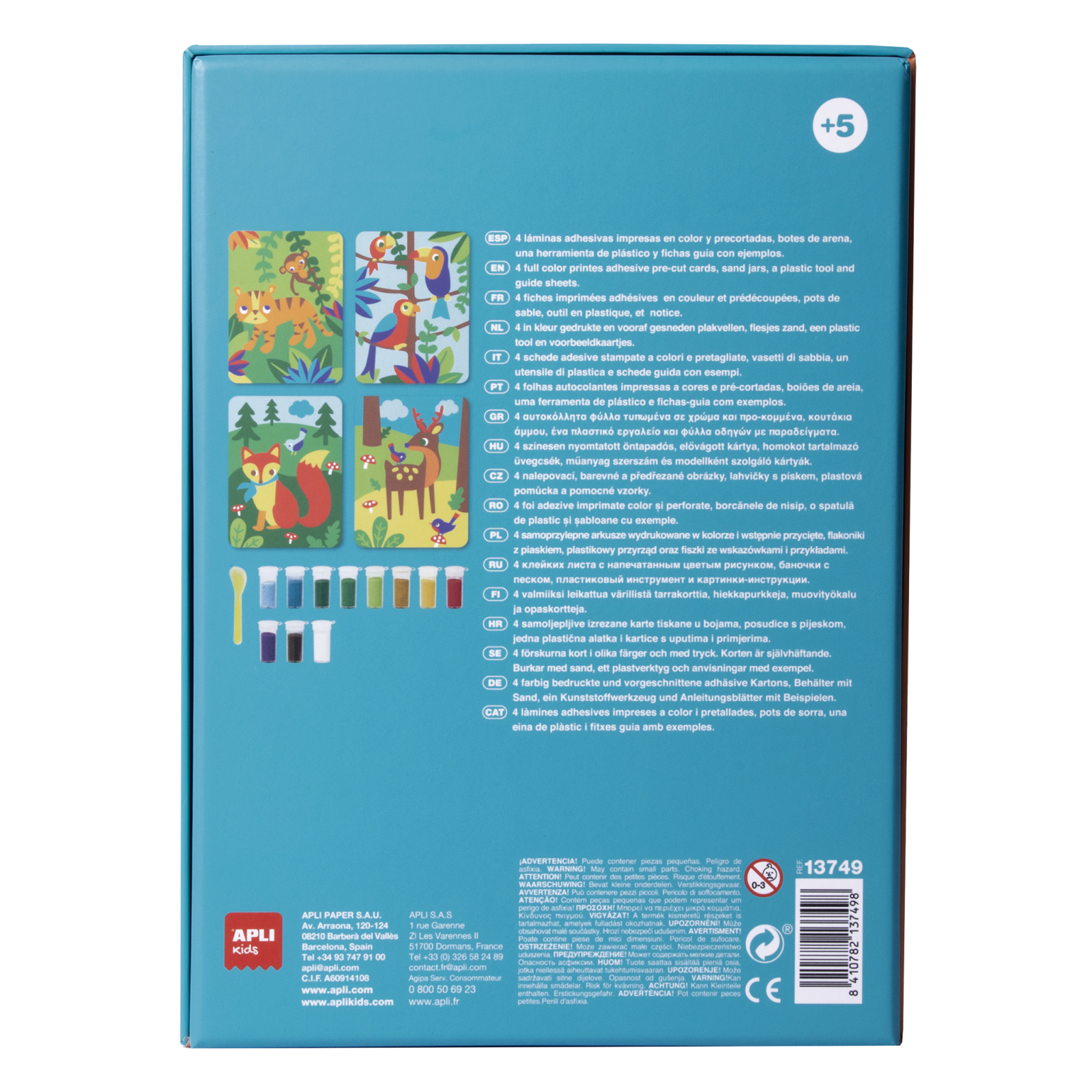 Un joc pentru a crea imagini cu nisip colorat. Ușor și distractiv: Trebuie doar să descoperi partea adezivă (folosind instrumentul inclus în pachet) și să întinzi nisipul pentru a colora desenele. Un design exclusiv APLI Kids, colorat și original. Un produs cu un conținut excelent, fiecare pachet conține tot materialul necesar pentru a crea 4 desene: 4 cartonașe cu modelele imprimate color, 10 cutii de nisip în culori diferite, 1 pungă de nisip alb și un instrument din plastic. Ușor de utilizat: cartonașele adezive imprimate nu necesită adeziv suplimentar, iar cutiile de nisip au un capac dozator pentru o precizie mai mare. Coloratul cu nisip are o valoare didactică ridicată: stimulează motricitatea fină, dezvoltă creativitatea, abilitățile manuale și simțul culorilor. În plus, favorizează îmbogățirea personală prin creația manuală. Recomandat copiilor de 4 ani sau mai mari.