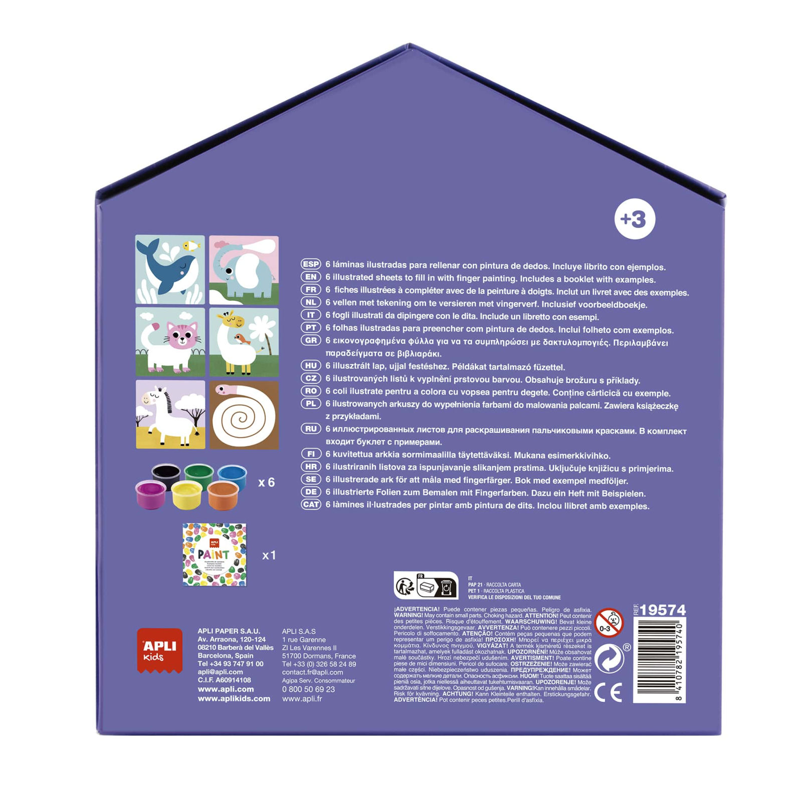 Setul include 6 planșe ilustrate cu animale, 6 recipiente cu vopsea pentru degete și un ghid cu instrucțiuni și exemple. Activitatea este simplă și intuitivă, fiind perfectă pentru primele experiențe artistice ale copiilor.