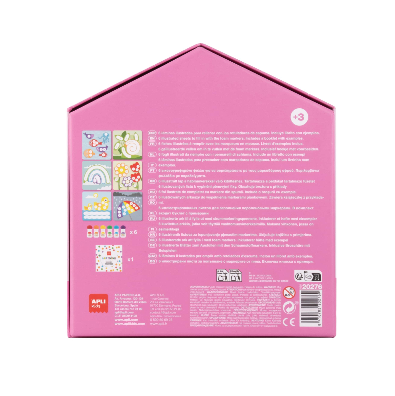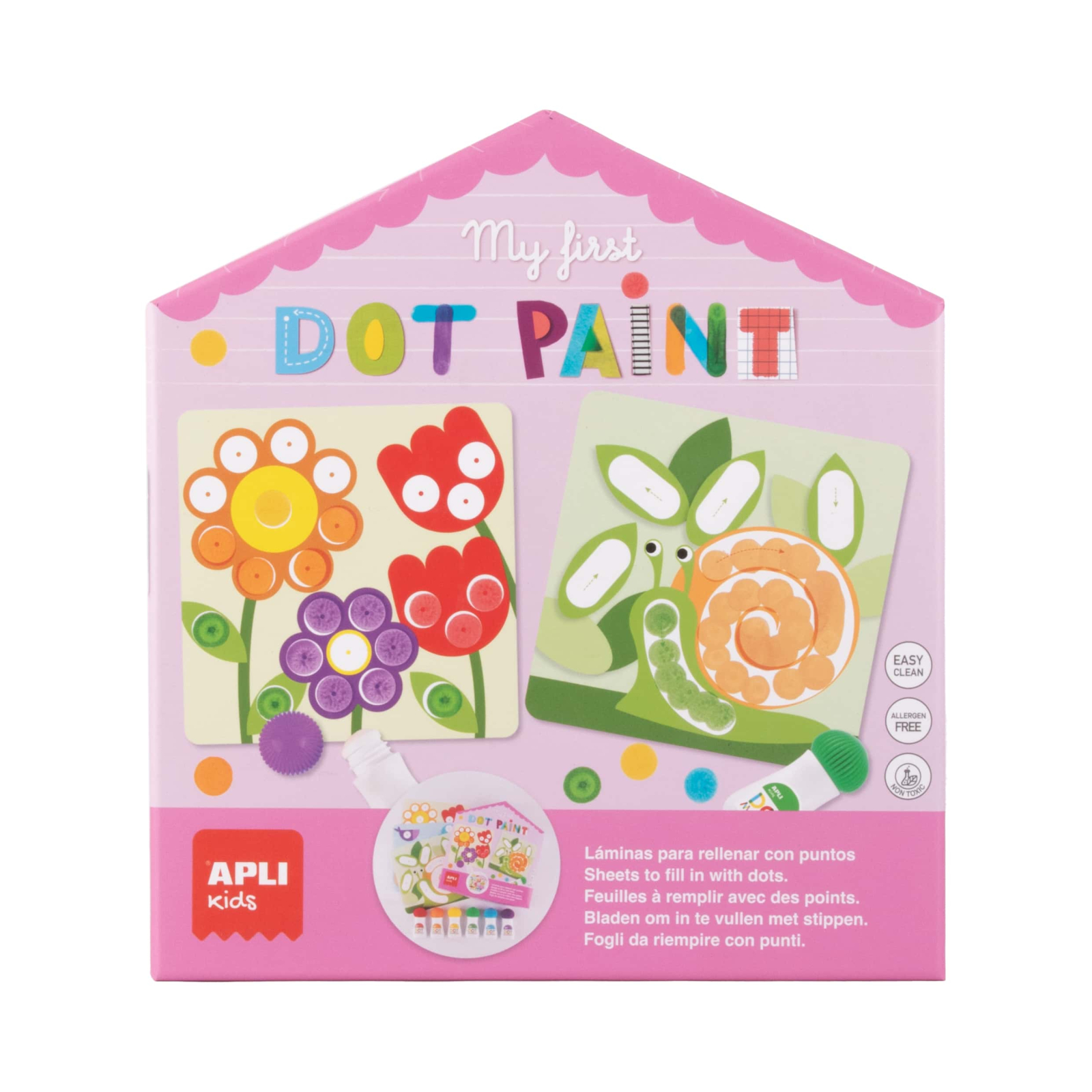 Setul include 6 planșe ilustrate cu teme variate și 6 markere colorate pentru pictură prin punctare. Activitatea este simplă și intuitivă: copiii aplică puncte de culoare pe zonele indicate, dezvoltându-și abilitățile artistice și motricitatea.