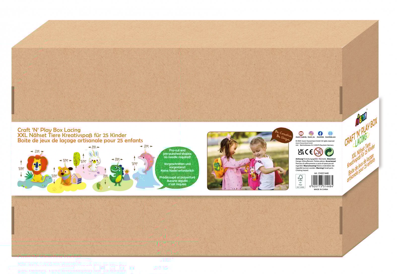 Cutia de joaca cu materiale pentru cusut Craft 39;N 39;Play Box - Lacing este destinata grupurilor de copii, claselor sau gradinitelor. Materialele din cutie sunt suficiente pentru 20 de copii si includ tot ce este necesar pentru a face 20 de proiecte de cusut cu tehnica siretului. Nu este nevoie de ac - foloseste un siret pentru a coase cele 2 bucati impreuna. Exersati abilitatile de insiretare si trasare. Folositi autocolante decorative din pasla pentru a decora. Conceput pentru a dezvolta abilitatile de coordonare ochi-mana si de concentrare. Pentru copii sa faca si sa ia peste tot! Varsta: 3 ani+