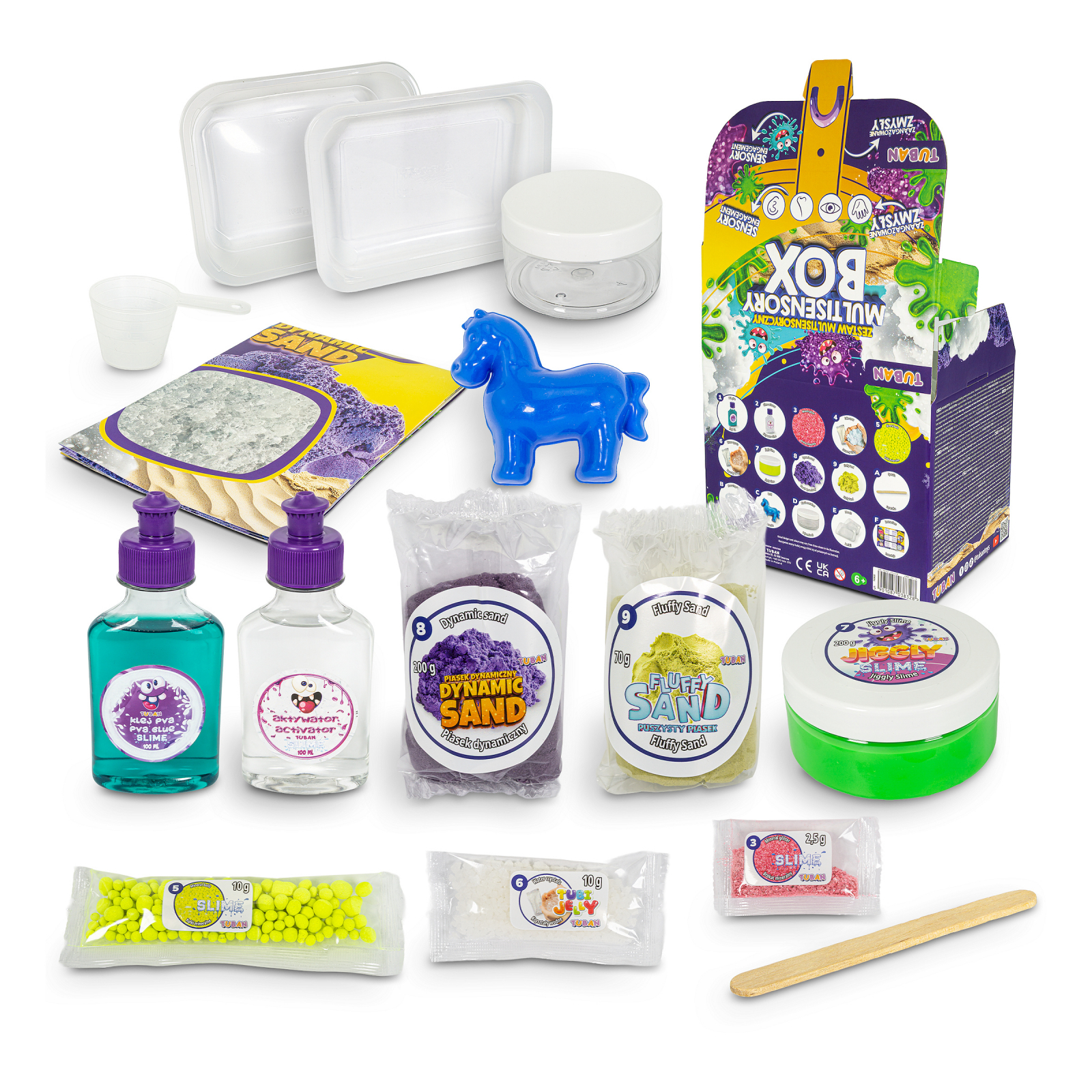 Kit senzorial multifunctional pentru copii peste 6 ani, care combina slime, nisip, cristale de apa si zapada artificiala pentru stimulare tactila si vizuala. Continutul pachetului: Ingrediente pentru slime + aditivi 2 tipuri de nisip: dinamic si fluffy Zapada artificiala Cristale de apa Accesorii pentru manipulare Instructiuni de utilizare Detalii tehnice esentiale: Varsta recomandata: 6+ ani (nu pentru sub 36 luni) Siguranta: sub supraveghere adulta, risc de inecare, nu pentru consum, poate pata Brand: Tuban Trade Sp. z o.o. (Polonia) Certificari: Produs conform standardelor, recomandari pentru folosire sigura incluse