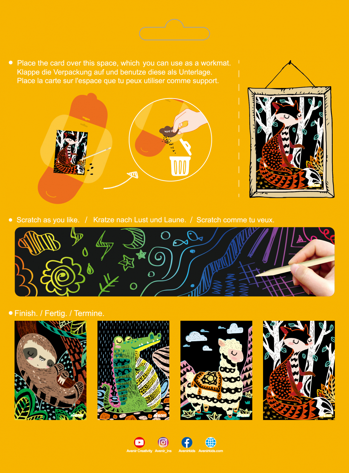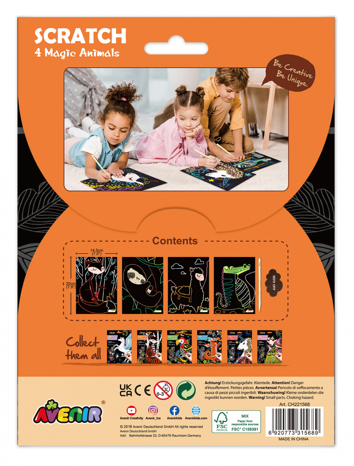 Creati opere de arta frumoase cu acest set Scratch Art de la Avenir. Tot ce trebuie sa faceti este sa zgariati suprafata neagra cu stiloul de zgarietura inclus pentru a descoperi un design uimitor viu colorat. Acest set de arta captivant este format din patru animale diferite de zgariat si dezvaluit. Dimensiune: 23 x 23 x 1 cm Varsta 3 ani+ Linia de seturi razuibile de la Avenir este indeosebi apreciata pentru ilustratiile sale fantastice. De asemenea, parintii pot alege cu usurinta dintr-o gama foarte variata atat pe tematici dar si pe varste, existand seturi potrivite atat pentru varste mici (3 ani+) cat si pentru varste mai mari ( 5 ani, 7 ani), dar astfel ocazia fiecarui copil sa isi exprime creativitatea in functie de abilitati sale. Contine: 4 cartonase de razuit; 1 pasla; 1 instrument de razuit