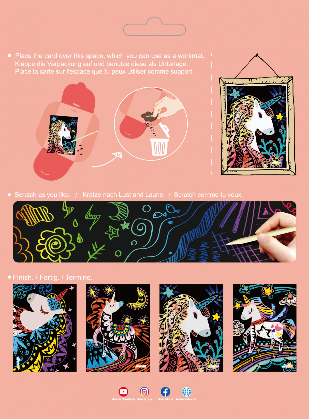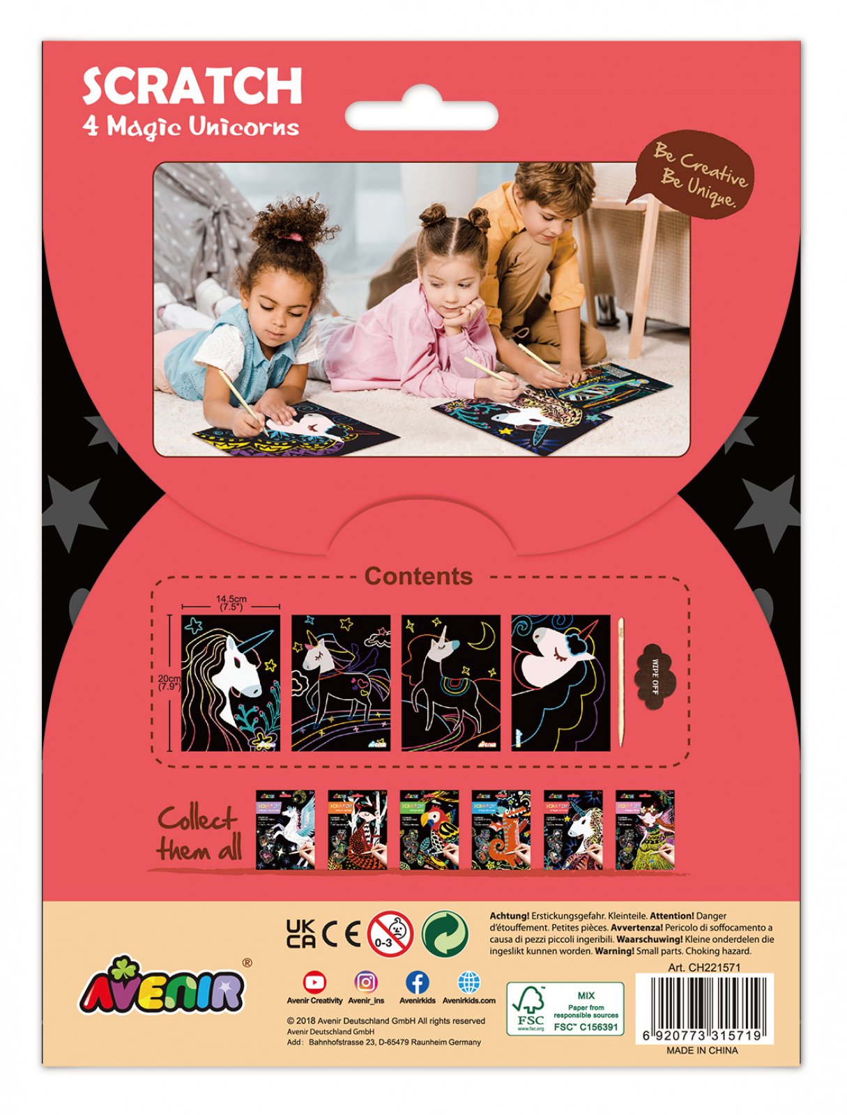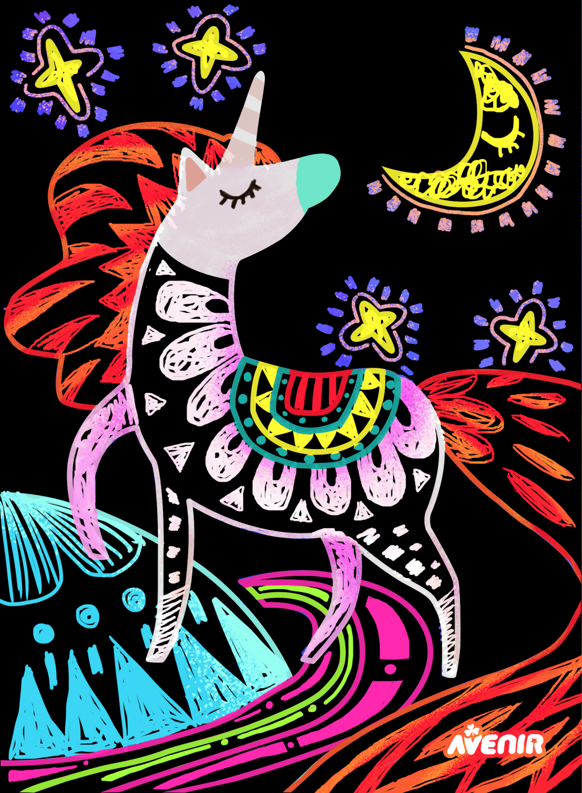 Creati opere de arta frumoase cu acest set Scratch Art de la Avenir. Tot ce trebuie sa faceti este sa zgariati suprafata neagra cu stiloul de zgarietura inclus pentru a descoperi un design uimitor viu colorat. Acest set de arta captivant consta din patru Unicorni diferiti de zgariat si dezvaluit. Dimensiune: 23 x 23 x 1 cm Varsta 3 ani+ Linia de seturi razuibile de la Avenir este indeosebi apreciata pentru ilustratiile sale fantastice. De asemenea, parintii pot alege cu usurinta dintr-o gama foarte variata atat pe tematici dar si pe varste, existand seturi potrivite atat pentru varste mici (3 ani+) cat si pentru varste mai mari ( 5 ani, 7 ani), dar astfel ocazia fiecarui copil sa isi exprime creativitatea in functie de abilitati sale. Contine: 4 cartonase de razuit; 1 pasla; 1 instrument de razuit