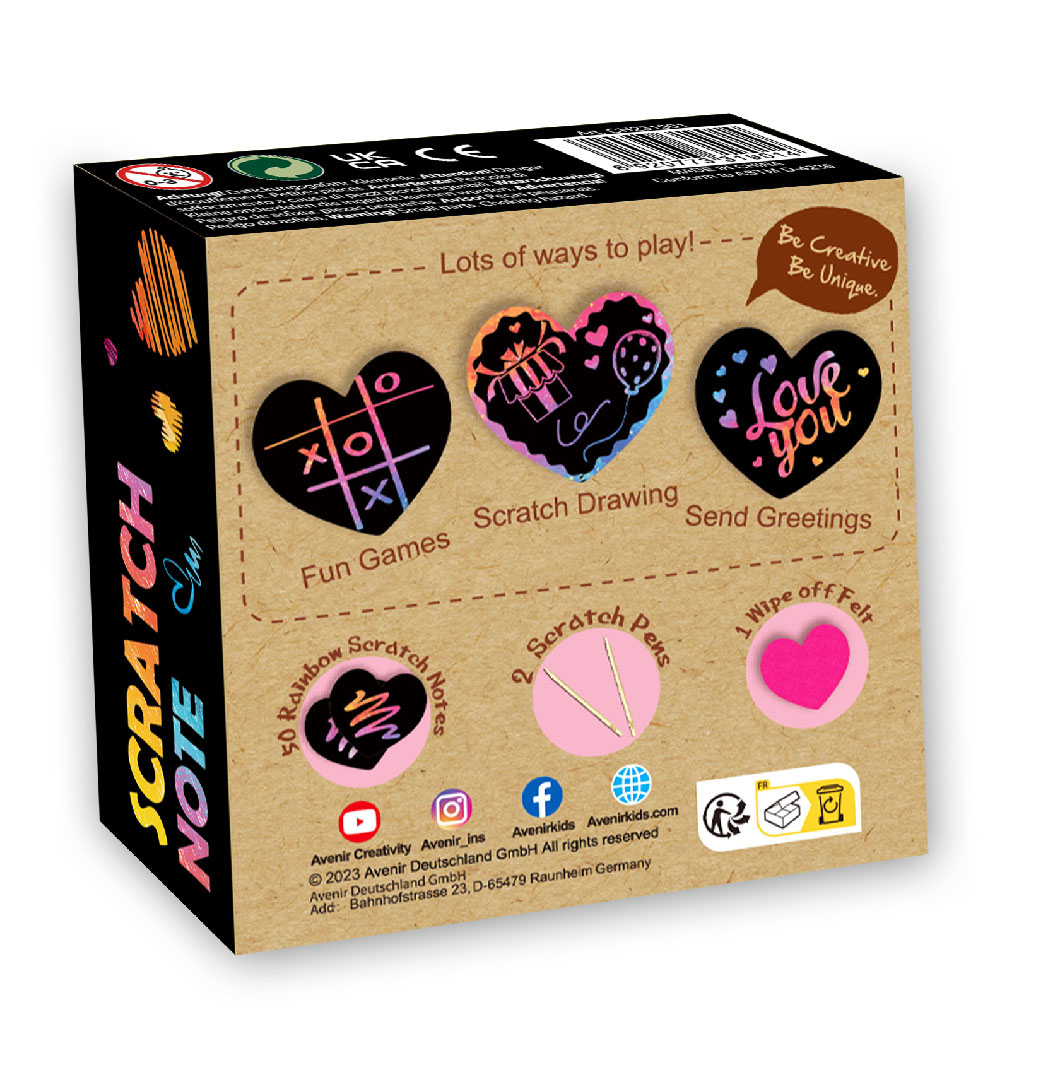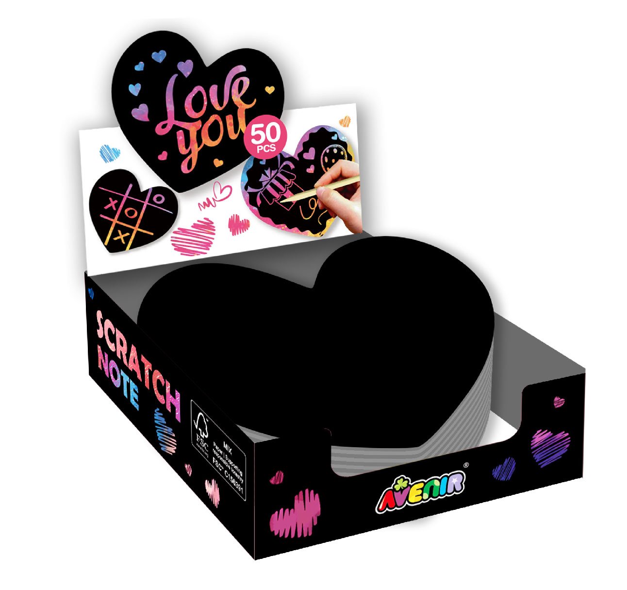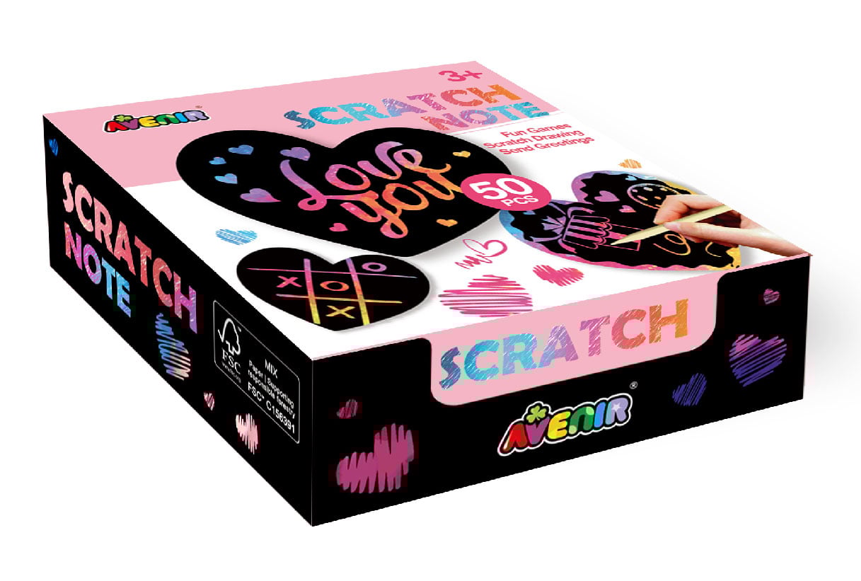 Notele originale Avenir Scratch Notes au fost pe termen lung top 3 cele mai bine vandute de la lansare, acum adaugam inca un best-seller la linie! Setul de razuit uimitor de viu colorat de la Avenir ii va distra pe cei mici. Razuieste hartia neagra speciala pentru a colora scene, pentru a transmite mesaje, a te juca jocuri sau a face felicitari pentru prietenii tai. Varsta recomandata 3 ani+ Dimensiune: 9 x 9 x 1 cm Linia de seturi razuibile de la Avenir este indeosebi apreciata pentru ilustratiile sale fantastice. De asemenea, parintii pot alege cu usurinta dintr-o gama foarte variata atat pe tematici dar si pe varste, existand seturi potrivite atat pentru varste mici (3 ani+) cat si pentru varste mai mari ( 5 ani, 7 ani), dand astfel ocazia fiecarui copil sa isi exprime creativitatea in functie de abilitati sale. Contine: 50 cartonase de razuit in forma de inima ; 2 instrumente de razuit, o bucata material textil pentru a sterge