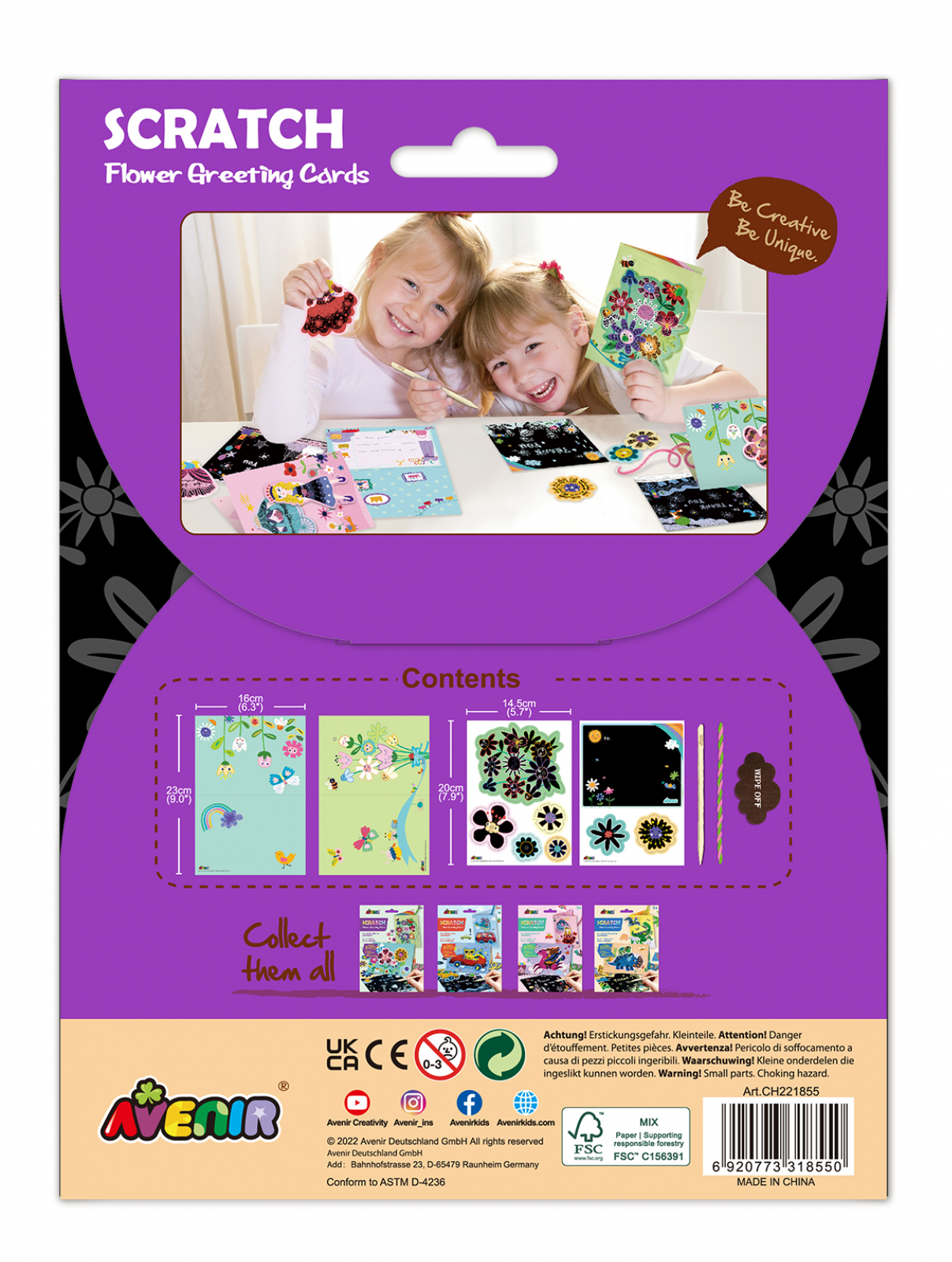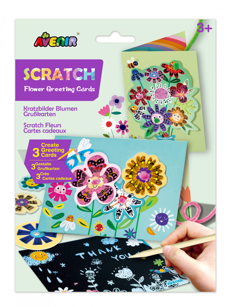 Felicitarile Avenir Scratch sunt o modalitate draguta pentru copii de a-si exprima dragostea si cele mai bune urari celor dragi cu ocazia sarbatorilor si a ocaziilor speciale. Sau fara nici o ocazie! Bucurati-va de acest superb pachet de flori! Fiecare pachet include 2 felicitari si o carte postala pe care sa o decorezi cu flori. Tot ce este necesar este inclus in pachet pentru a realiza felicitari minunate care exprima imaginatia si creativitatea copilului, spre incantarea celor care le primesc. Distractia scratch art este acum disponibila sub forma de kituri de felicitari pentru copii! Varsta recomandata 3 ani+ Linia de seturi razuibile de la Avenir este indeosebi apreciata pentru ilustratiile sale fantastice. De asemenea, parintii pot alege cu usurinta dintr-o gama foarte variata atat pe tematici dar si pe varste, existand seturi potrivite atat pentru varste mici (3 ani+) cat si pentru varste mai mari ( 5 ani, 7 ani), dar astfel ocazia fiecarui copil sa isi exprime creativitatea in functie de abilitati sale.
