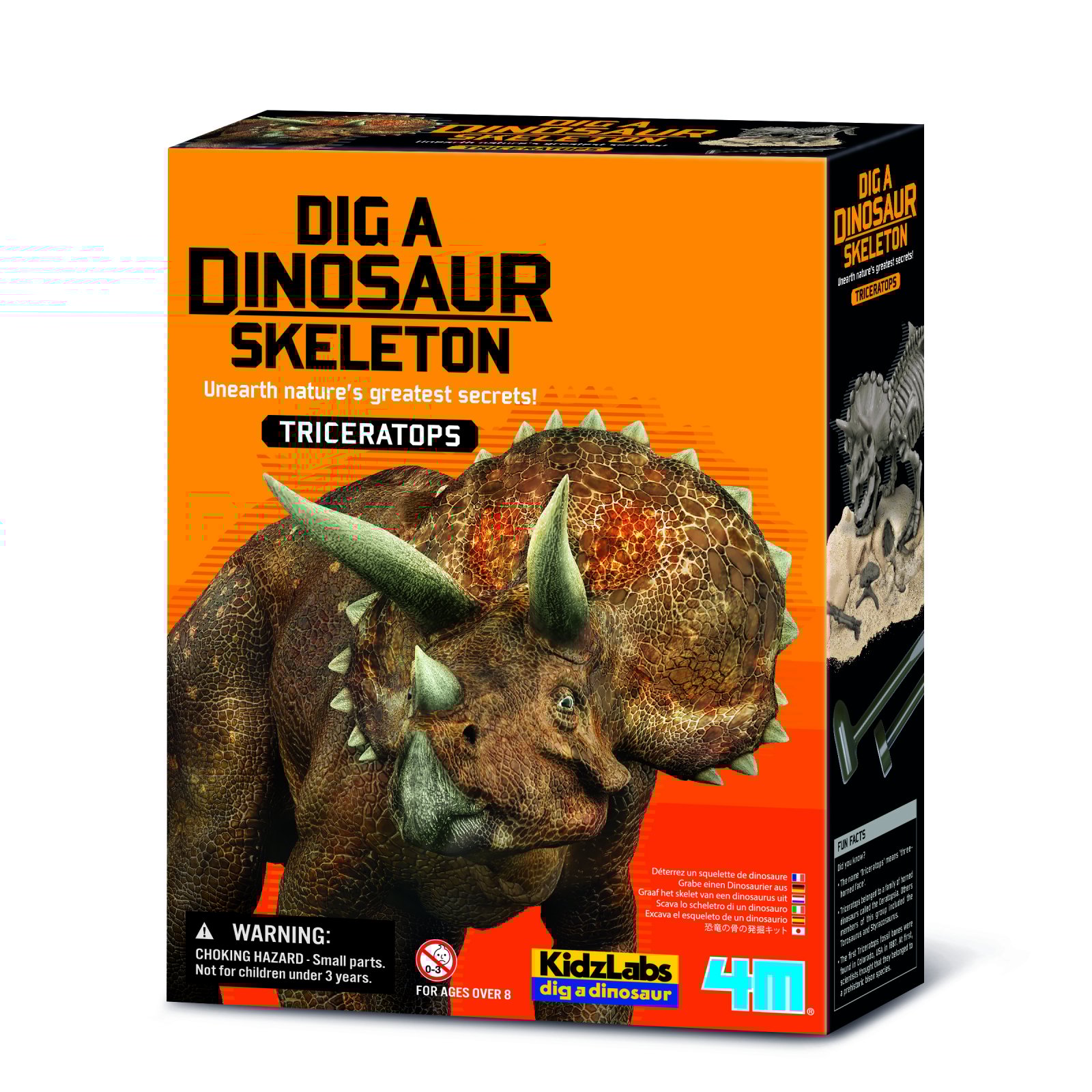 Sapa un dinozaur Triceratops: incorporat in acest bloc dur de ipsos este un schelet complet, realist al unui Triceratops , si depinde de tine sa-l scoti. Utilizati capatul plat al instrumentului de sapat pentru a razui cu grija bucati de tencuiala, putin cate putin. Odata ce ai lovit osul, treceti la perie pentru a o elibera usor de praf. Toate oasele se conecteaza cu usurinta intre ele si se tin puternic folosind ceara moale inclusa. Configurati afisajul uimitor, astfel incat toata lumea sa va poata verifica descoperirea fascinanta , Exista chiar si lucruri amuzante despre Triceratops imprimate pe spate. Sapa, descopera si inspira-te cu setul 4M Dig A Dinosaur. Schelet afisabil de Triceratops incorporat in caramida de ipsos. Incurajeaza dexteritatea motrica fina, pasiunea pentru invatare si interesul pentru paleontologie. Copiii se simt ca niste adevarati paleontologi care isi scot propriul schelet de dinozaur. O unealta de sapat faciliteaza taierea caramizii de ipsos. Utilizati o perie pentru a indeparta usor praful din jurul oaselor. Include bloc de ipsos cu schelet Triceratops incorporat, unealta de sapat, perie, ceara moale pentru pozitionarea fosilei, afisaj din carton cu platforma si fapte amuzante. Instructiuni detaliate de asamblare si ingrijire incluse. Scheletul masoara aproximativ 19 cm inaltime cand este asamblat. Materiale de calitate pentru experienta exceptionala de paleontolog. Acest set este un proiect stiintific distractiv pentru copii si intreaga familie, care dezvolta concentrarea, capacitatea de rezolvare a problemelor si motricitatea fina! Varsta 8+; cu ajutorul unui adult, poate fi folosit inca de la 5 ani. Dimensiune cutie: 17 cm x 22 cm x 6 cm