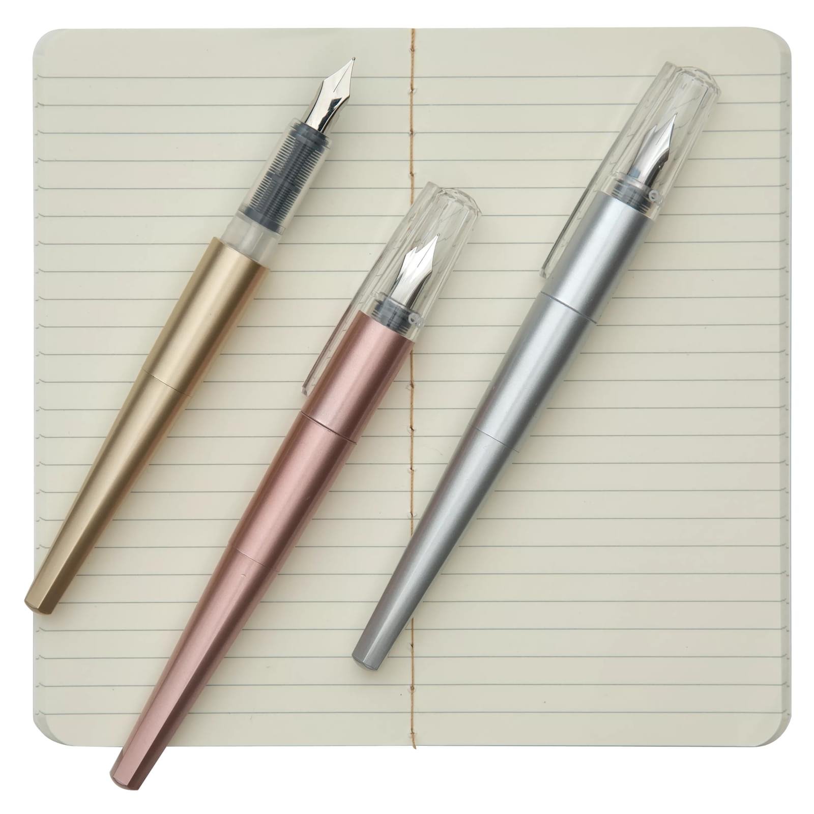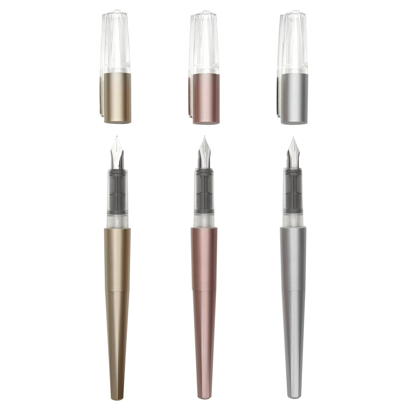 Scrieti proza eleganta, idei creative sau pur si simplu evenimentele zilei in stil rafinat cu acest set de scris cu stilouri. Conceput cu gandul la caligrafie, cele 3 stilouri cu cerneala neagra in culorile metalice Gold, Rose Gold si Silver sunt perfect asortate cu un carnet subtire de 60 de pagini Gold si Silver ombre. Arata-ti abilitatile de scriere cu acest set de scris cu stilouri care include trei stilouri cu cerneala neagra stralucitoare, rezerve de cerneala si un jurnal de hartie. Corpurile cu aspect metalic si varfurile stilourilor va ofera un control suprem asupra liniilor dvs. si fac ca scrisul frumos sa iasa cu adevarat in evidenta. Iar daca aveti nevoie de mai multa cerneala, tot ce va trebuie sunt rezervele Splendid de la Ooly. Carnetul finut cu pagini subtiri inclus vine cu o coperta superba asortata, de culoare aurie si argintie ombre, si are 60 de pagini aliniate. Este perfect pentru a se strecura cu usurinta intr-o geanta sau intr-un buzunar. Asortati acest set cu creioanele Modern Graphite si pentru o colectie suprema de papetarie glamorous! 3 stilouri cu cerneala neagra in auriu, auriu roz si argintiu - combinati si asortati in stil fabulos Carnet de 60 de pagini cu coperta din folie ombre argintie si aurie - asorteaza-te cu stilourile tale Se asorteaza perfect cu creioanele Modern Graphite Pencils Potrivit pentru varste de la 12 ani in sus Se potriveste numai cu rezervele de cerneala pentru stilouri OOLY