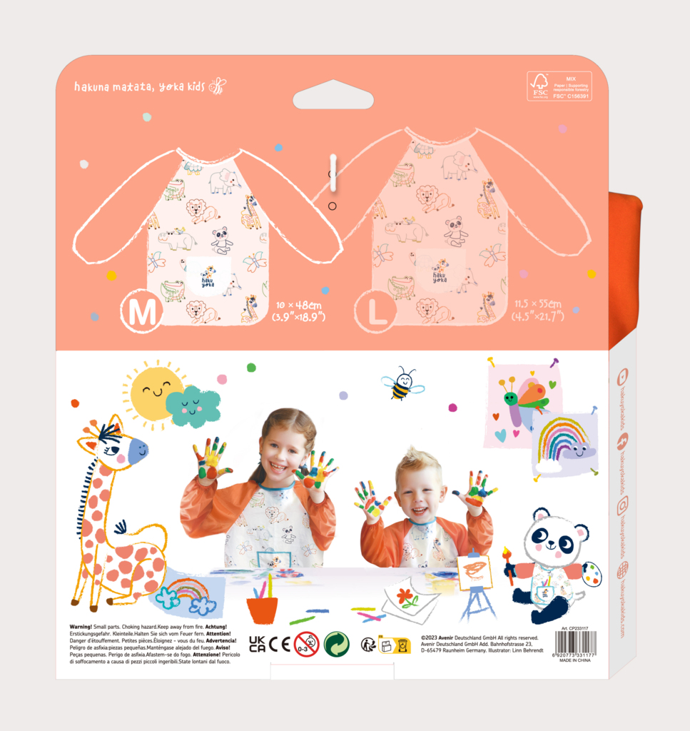 Descoperiti bucuria creatiei fara grija petelor cu Sortul de pictura protectie Micul Artist de la Haku Yoka, special conceput pentru micii artisti de la 3 ani in sus! Acest sort practic si vesel este ideal pentru a proteja hainele copilului in timpul activitatilor artistice, transformand fiecare sesiune de pictura intr-o experienta distractiva si lipsita de griji. Caracteristici principale: Design Atractiv si Colorat : Sortul de pictura protectie Micul Artist vine intr-un design vesel si colorat, care va incanta orice copil. Cu motive jucause si culori vibrante, acest sort va deveni rapid preferatul micilor creatori. Material Durabil si Rezistent : Realizat din materiale de calitate superioara, sortul este rezistent la apa si pete, asigurand protectia optima a hainelor copilului. Materialul durabil garanteaza utilizarea indelungata, chiar si in timpul celor mai intense sesiuni de creatie. Usor de Curatat : Sortul este foarte usor de curatat, putand fi spalat manual sau la masina de spalat. Astfel, parintii pot mentine sortul in stare perfecta cu minim efort. Potrivit pentru Copii de 3 ani + : Dimensiunile sortului sunt ideale pentru copiii de la 3 ani in sus, asigurand o potrivire confortabila si libertate de miscare. Designul practic cu legaturi ajustabile permite adaptarea sortului la dimensiunile copilului. Protectie Completa: Sortul acopera bine partea frontala si laterala a corpului, oferind o protectie completa impotriva petelor de vopsea, markere sau alte materiale de arta. Copiii se pot bucura de activitatile lor preferate fara sa-si murdareasca hainele. Incurajeaza Creativitatea : Prin eliminarea grijii pentru pete, sortul Micul Artist incurajeaza copiii sa se exprime liber si sa exploreze diverse tehnici artistice. Este un accesoriu indispensabil pentru orice mic artist in devenire. Dimensiuni: Potrivit pentru copii de 3 ani si peste, sortul are dimensiuni ideale pentru a se potrivi confortabil si pentru a oferi libertate de miscare. Instructiuni de utilizare : Imbracati sortul peste hainele copilului si ajustati legaturile pentru o potrivire confortabila. Dupa utilizare, spalati sortul conform instructiunilor de pe eticheta pentru a-l mentine curat si pregatit pentru urmatoarea sesiune de creatie. Atentie! Piese mici. Pericol de sufocare. Avertisment! Pastrati departe de foc! Supravegherea unui adult este necesara in permanenta.
