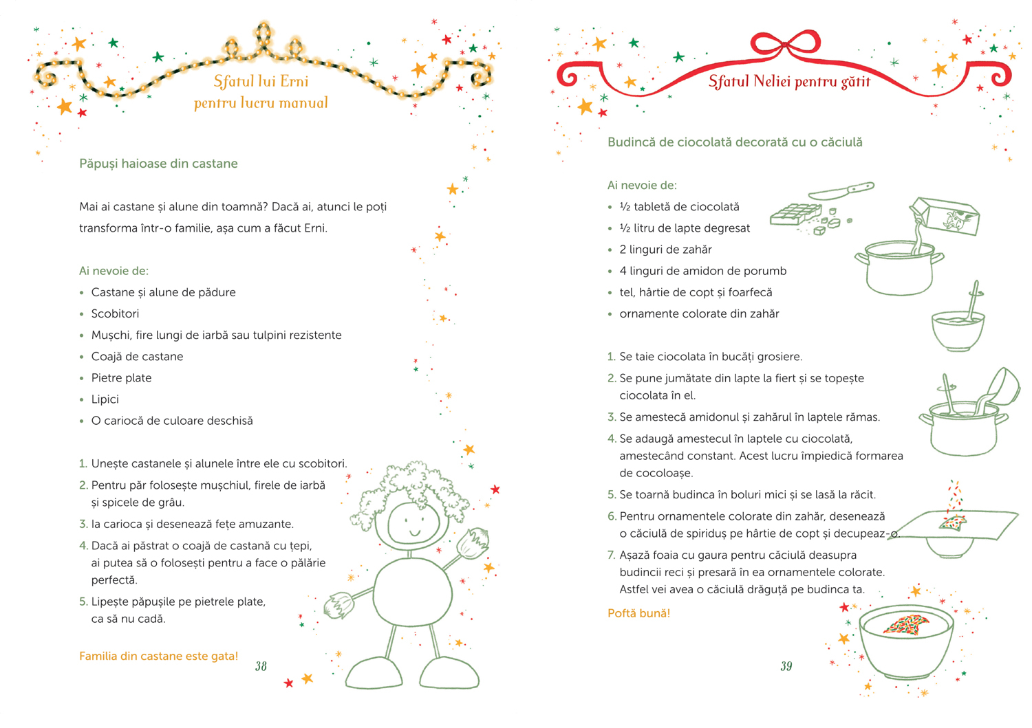 Cartea include și activități pentru copii, cum ar fi sfaturi pentru confecționarea de coliere din pene colorate, păpuși din castane și alte decorațiuni de Crăciun, care le permit copiilor să participe activ la atmosfera festivă.