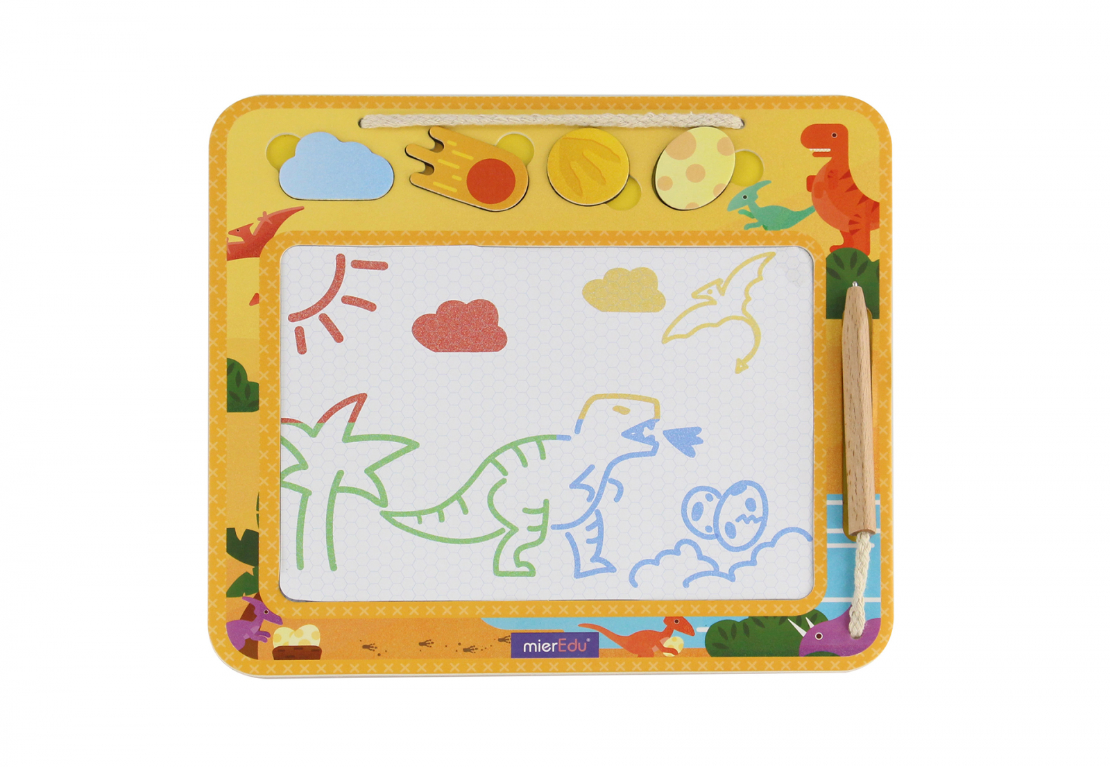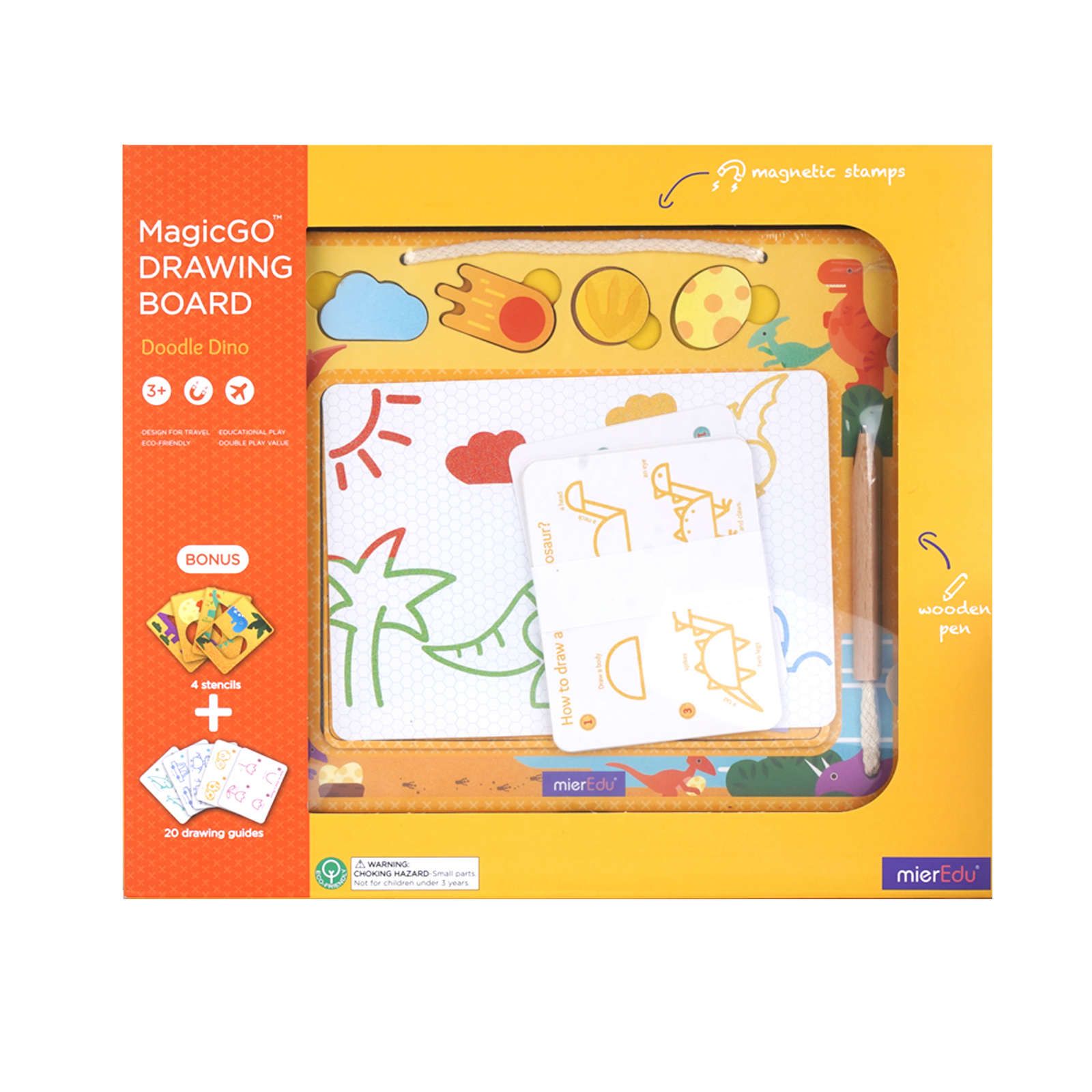 O plansa de desen magica ecologica pentru ore intregi de joaca creativa. Creioneaza, scrie sau deseneaza cu stiloul atasat si foloseste patru stampile magnetice tematice pentru a-ti crea capodoperele. Caracteristici: Perfecta pentru joaca din mers, plansa compacta si usoara cu patru culori vii Clic magic pentru a sterge tabla in cateva secunde Folositi stampila pe post de radiera pe partea din spate pentru a sterge desenele dintr-o anumita zona Carton robust cu margini rotunjite si colturi moi 1 sablon mare si 20 de desene pas cu pas pentru a dezvolta abilitatile de desenare Dimensiune cutie: 34,2 4 29,8 cm Include: 1 plansa de desen 20 de cartonase pas cu pas 4 sabloane 4 stampile magnetice 1 creion de lemn atasat Varsta: 3+.