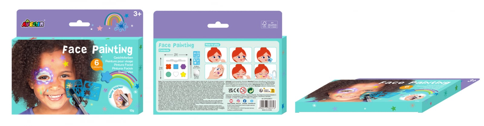 Adauga magie si culoare fiecarui moment de joaca cu Trusa Make-Up Pictura Fata cu sabloane Incluse , žCurcubeu si Stele, ! Acest set creativ este ideal pentru micii artisti care vor sa isi exprime imaginatia si sa creeze designuri uimitoare pe fata, inspirate de frumusetea cerului. Caracteristici principale: Culori Non-Alergice si Sigure: Trusa contine sase culori vibrante, non-alergice, formulate special pentru a fi blande cu pielea sensibila a copiilor. Vopselele de inalta calitate sunt sigure si usor de curatat, asigurand o experienta placuta si fara griji pentru parinti. sabloane Incluse: Setul include sabloane tematice de curcubeu si stele, facilitand crearea de designuri detaliate si fermecatoare. sabloanele sunt usor de utilizat, permitand copiilor sa realizeze rapid si simplu opere de arta pe fata. Usor de Aplicat si Indepartat: Vopselele sunt simplu de aplicat si se usuca rapid, astfel incat micutii sa se bucure de transformarile lor magice in cateva minute. Indepartarea se face usor, cu apa calda si sapun, fara a lasa urme pe piele. Tematica Curcubeu si Stele: Designurile incluse sunt inspirate de frumusetea cerului, cu curcubee colorate si stele stralucitoare, aducand un strop de magie si veselie fiecarei creatii. Aceste teme sunt perfecte pentru petreceri, carnavaluri sau joaca de zi cu zi. Ideal pentru Petreceri si Evenimente Speciale: Trusa Make-Up Pictura Fata este ideala pentru orice ocazie, de la petreceri de aniversare la festivaluri si evenimente scolare. Este o modalitate minunata de a aduce zambete si distractie, transformand orice moment intr-o experienta de neuitat. Dimensiune: Trusa compacta este usor de transportat si depozitat, ideala pentru utilizare acasa sau in deplasare. Include tot ce ai nevoie pentru a incepe imediat , culori, pensule si sabloane. Instructiuni de utilizare: Alege sablonul dorit si fixeaza-l pe fata. Aplica vopseaua cu ajutorul pensulei incluse, asigurandu-te ca acoperi uniform toate zonele. Dupa ce designul este complet, indeparteaza sablonul si lasa vopseaua sa se usuce. La final, curata pielea cu apa calda si sapun pentru a indeparta vopseaua. Contine: 1 pensula 1 abtibild oglinda 2 sabloane 6 vopsele de fata Atentie: Inainte de utilizare, verificati sa nu existe alergii sau infectii ale pielii. Aplicati pe pielea curata si uscata. Nu utilizati pe pielea ranita, vanata sau zgariata Evitati contactul cu ochii si buzele, in caz de contact clatiti bine cu apa curata, in caz de iritatie intrerupeti utilizarea, daca iritatia persista consultati un medic. Protejati suprafetele de lucru si imbracamintea inainte de utilizare. A se depozita in locuri racoroase si uscate, ferite de lumina directa a soarelui. Avertisment! Piese mici. Pericol de sufocare.