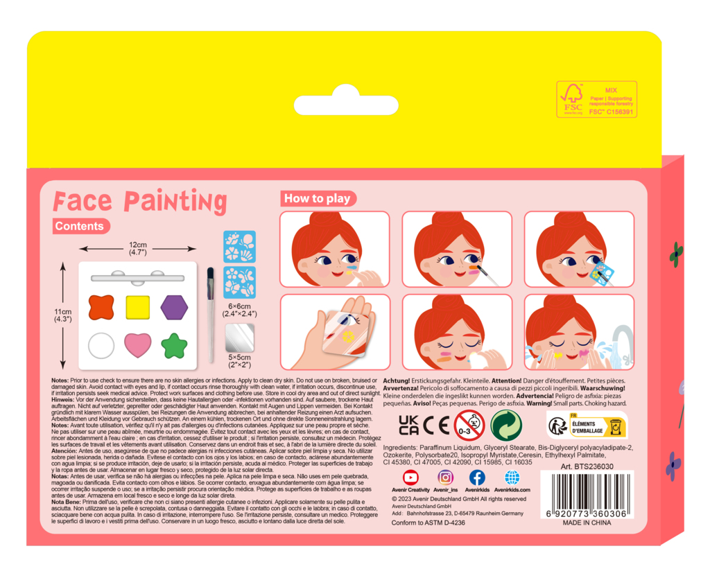 Transformati fiecare petrecere si moment de joaca intr-o explozie de culoare si creativitate cu Trusa Make-Up Pictura Fata cu sabloane Incluse , žFlori si Fluturi, ! Acest set complet este perfect pentru micii artisti care doresc sa isi exprime imaginatia si sa creeze opere de arta pe propriile fete, aducand magia naturii mai aproape de ei. Caracteristici principale: Culori Non-Alergice si Sigure: Trusa include sase culori vibrante, non-alergice, special formulate pentru a fi delicate cu pielea sensibila a copiilor. Aceste vopsele de inalta calitate sunt sigure si usor de spalat, oferind o experienta placuta si fara griji pentru parinti. sabloane Incluse: Setul vine cu sabloane tematice de flori si fluturi, care fac aplicarea machiajului usoara si distractiva. Copiii pot folosi sabloanele pentru a crea design-uri detaliate si fermecatoare, stimulandu-si creativitatea si abilitatile artistice. Usor de Aplicat si Indepartat: Vopselele sunt usor de aplicat si se usuca rapid, permitand copiilor sa se bucure de transformarile lor magice in doar cateva minute. Indepartarea se face simplu, cu apa calda si sapun, fara a lasa urme pe piele. Tematica Florala si Fluturi: Design-urile incluse in trusa sunt inspirate de frumusetea naturii, cu flori si fluturi care aduc un strop de magie si veselie in fiecare desen. Aceste teme sunt perfecte pentru petreceri, carnavaluri, sau pentru joaca de zi cu zi. Ideal pentru Petreceri si Evenimente Speciale: Trusa Make-Up Pictura Fata este perfecta pentru orice ocazie, de la petreceri de aniversare la festivaluri si evenimente scolare. Este un mod minunat de a aduce zambete si distractie, transformand orice moment intr-o experienta de neuitat. Dimensiune: Trusa compacta este usor de transportat si de depozitat, fiind ideala pentru utilizare acasa sau in deplasare. Include tot ce ai nevoie pentru a incepe imediat , culori, pensule si sabloane. Instructiuni de utilizare: Alege sablonul dorit si fixeaza-l pe fata. Aplica vopseaua cu ajutorul pensulei incluse, asigurandu-te ca acoperi uniform toate zonele. Dupa ce design-ul este complet, indeparteaza sablonul si lasa vopseaua sa se usuce. La final, curata pielea cu apa calda si sapun pentru a indeparta vopseaua. Contine: 1 pensula 1 abtibild oglinda 2 sabloane 6 vopsele de fata Atentie: Inainte de utilizare, verificati sa nu existe alergii sau infectii ale pielii. Aplicati pe pielea curata si uscata. Nu utilizati pe pielea ranita, vanata sau zgariata Evitati contactul cu ochii si buzele, in caz de contact clatiti bine cu apa curata, in caz de iritatie intrerupeti utilizarea, daca iritatia persista consultati un medic. Protejati suprafetele de lucru si imbracamintea inainte de utilizare. A se depozita in locuri racoroase si uscate, ferite de lumina directa a soarelui. Avertisment! Piese mici. Pericol de sufocare.