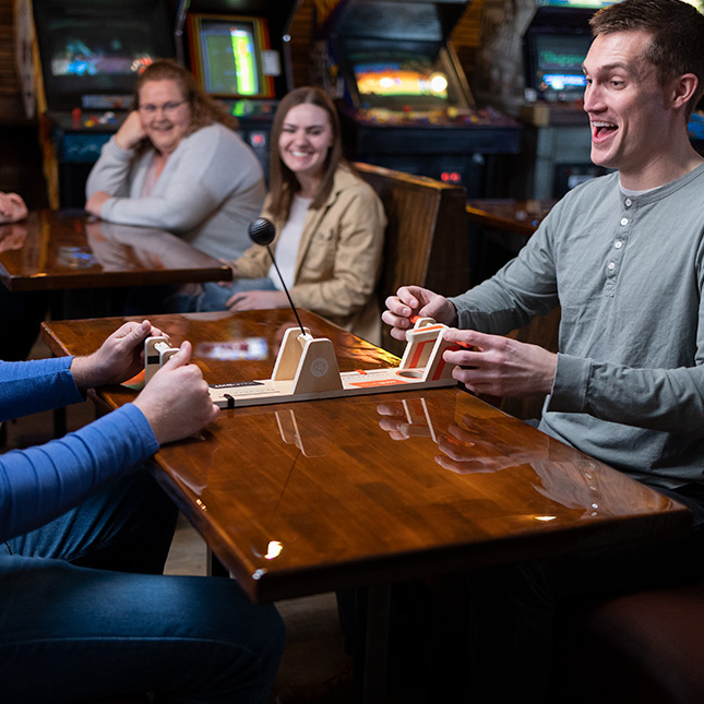 Joc de masa pentru 2 jucatori cu mingi catapultate. Competitie distractiva si reflexe rapide.